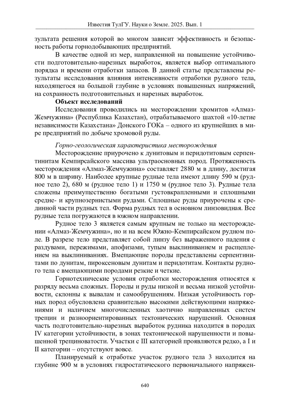 5. Бекбергенов Д.К., Джангулова Г.К., Бектур Б.К. Определение граничного влияния очистных работ при комбинированной геотехнологии на глубоких горизонтах шахт Донских хромитов // Комплексное использование минерального сырья. 2020. № 1 (312). С. 69-77. EDN: ZXOYPE