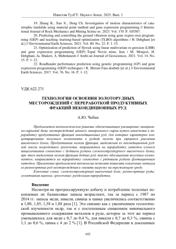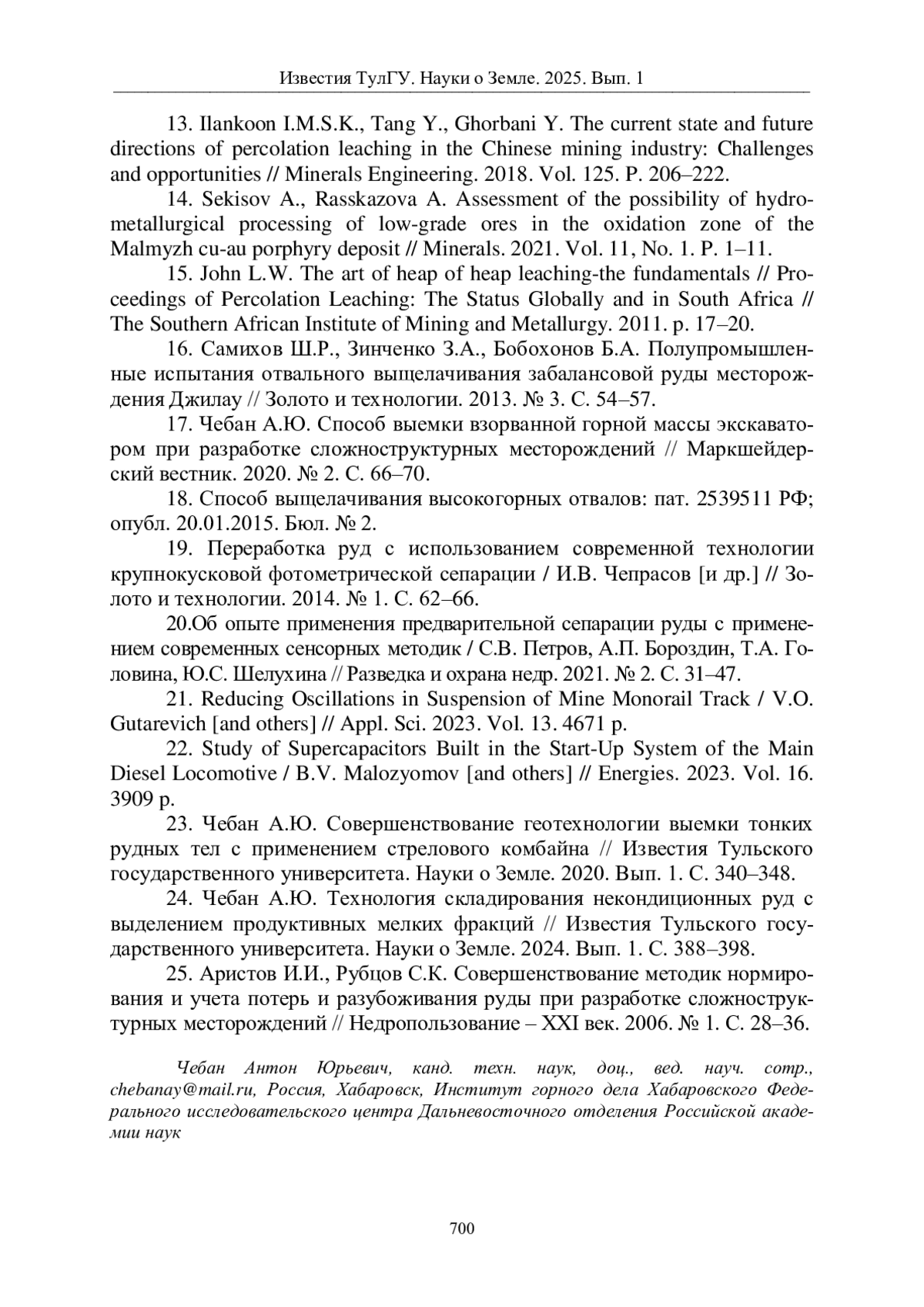 24. Чебан А.Ю. Технология складирования некондиционных руд с выделением продуктивных мелких фракций // Известия Тульского государственного университета. Науки о Земле. 2024. Вып. 1. С. 388-398. EDN: RTEYMK