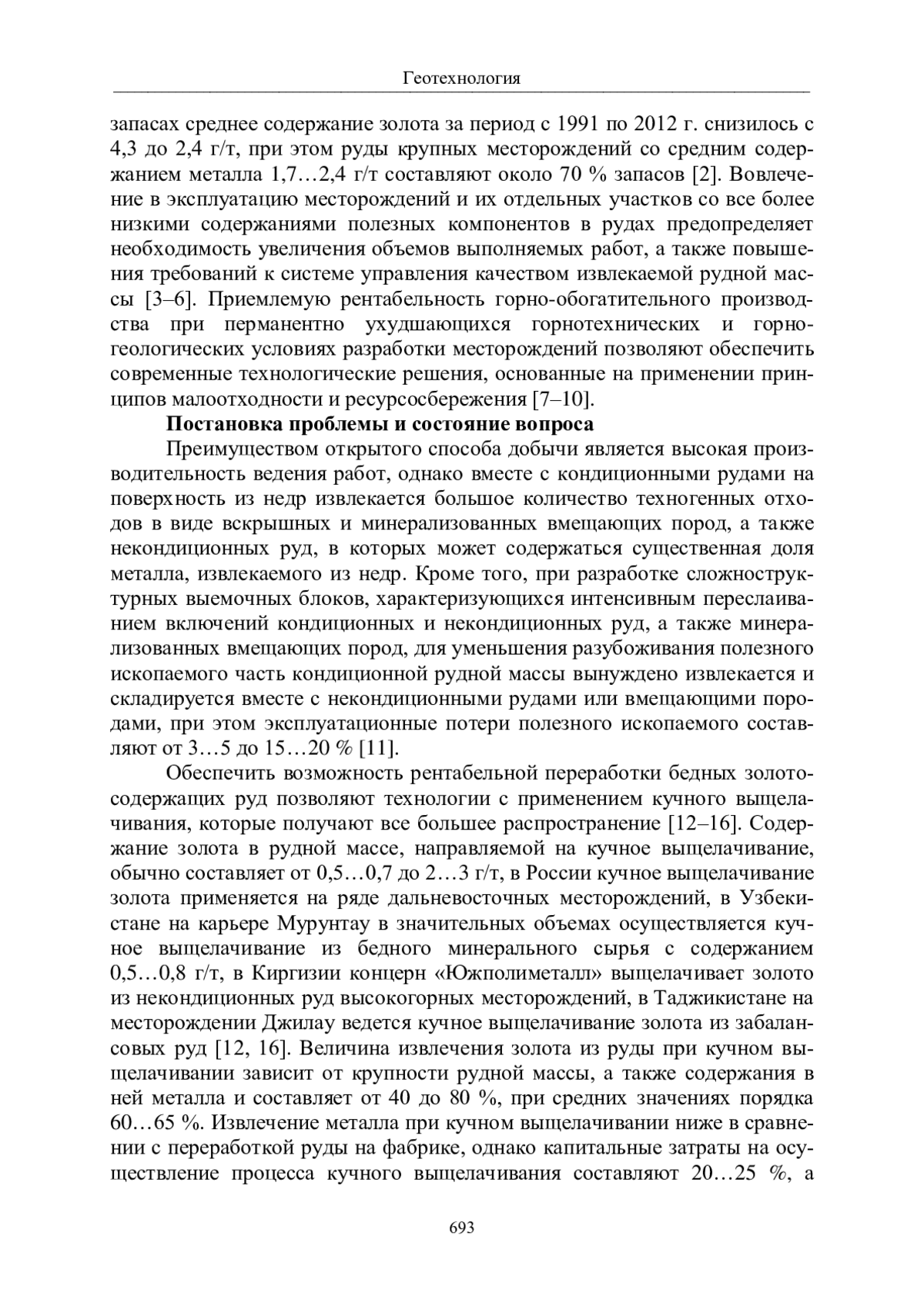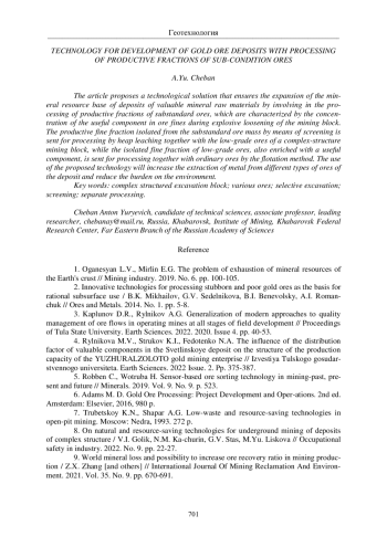 2. Инновационные технологии переработки упорных и бедных руд золота как основа рационального недропользования / Б.К. Михайлов, Г.В. Седельникова, Б.И. Беневольский, А.И. Романчук // Руды и металлы. 2014. № 1. С. 5-8. EDN: RYGVEH