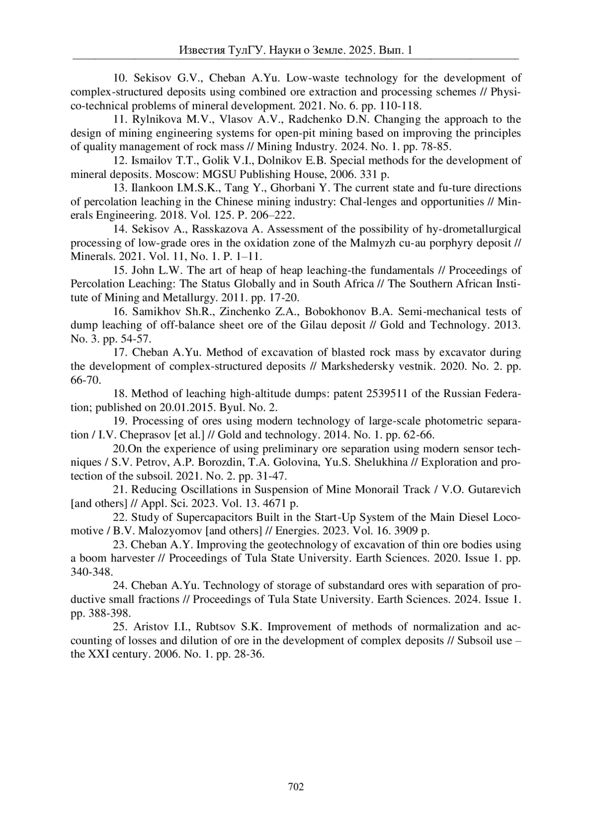 10. Секисов Г.В., Чебан А.Ю. Малоотходная технология освоения сложноструктурных месторождений с применением комбинированных схем выемки и переработки руд // Физико-технические проблемы разработки полезных ископаемых. 2021. № 6. С. 110-118. EDN: DNGOFF