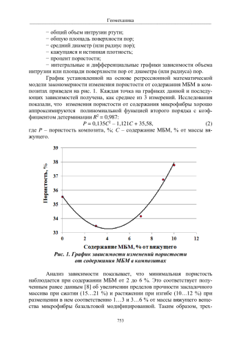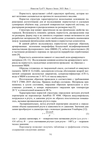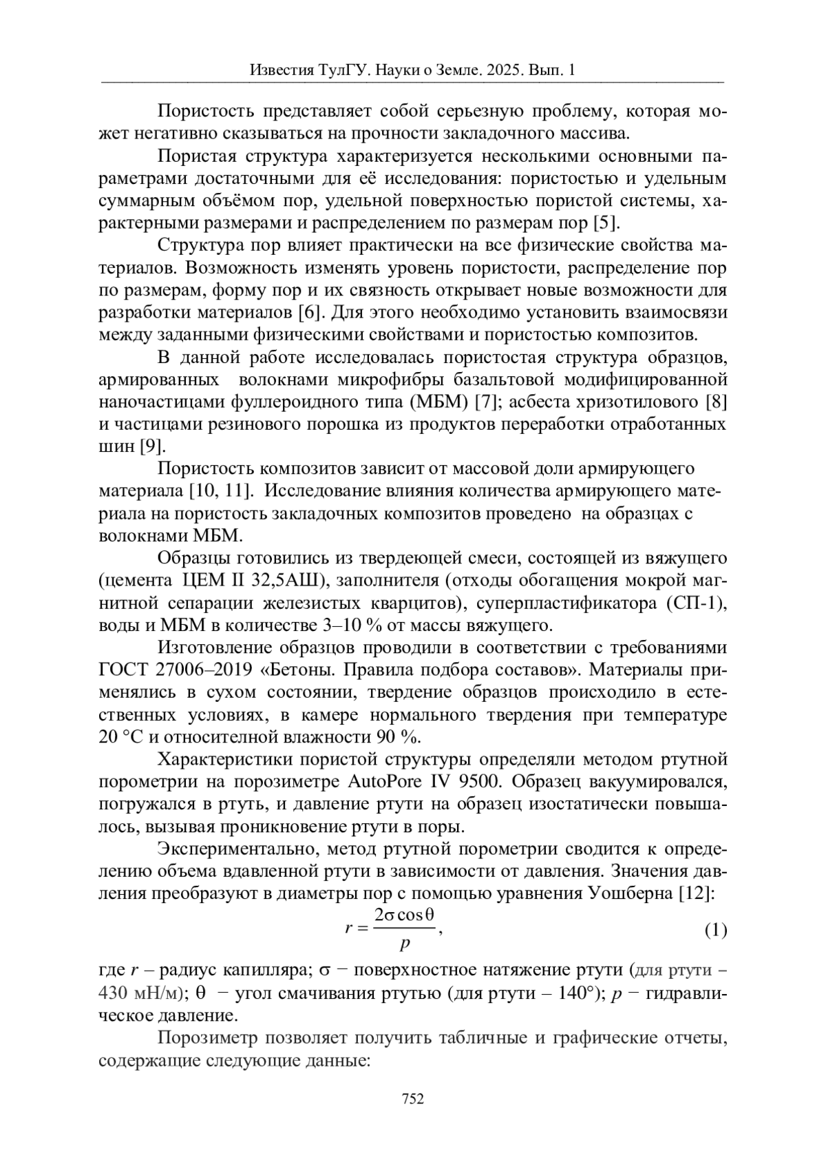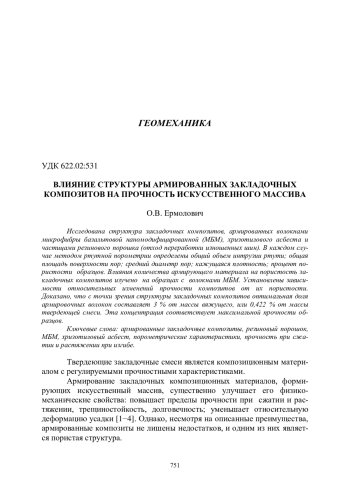 Армирование закладочных композиционных материалов, формирующих искусственный массив, существенно улучшает его физикомеханические свойства: повышает пределы прочности при сжатии и растяжении, трещиностойкость, долговечность; уменьшает относительную деформацию усадки [1−4]. Однако, несмотря на описанные преимущества, армированные композиты не лишены недостатков, и одним из них является пористая структура.