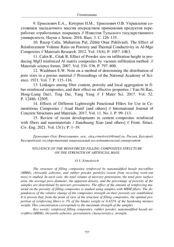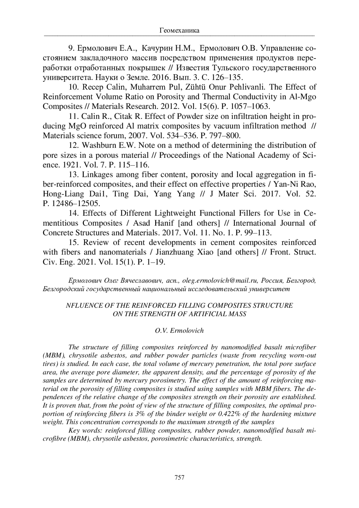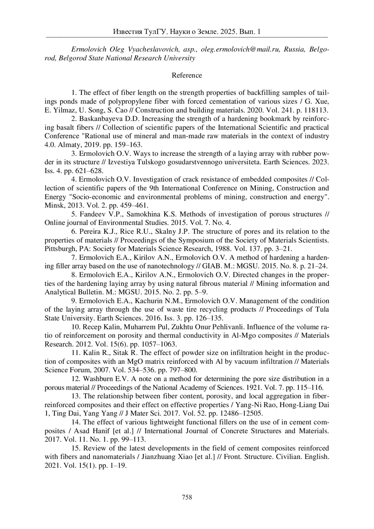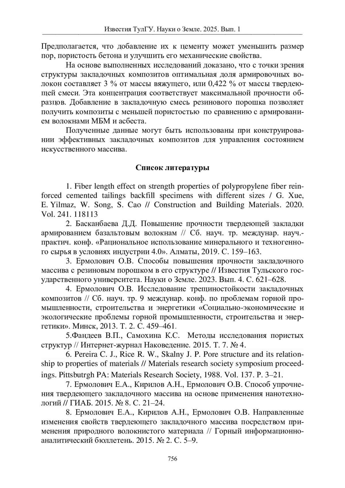 3. Ермолович О.В. Способы повышения прочности закладочного массива с резиновым порошком в его структуре // Известия Тульского государственного университета. Науки о Земле. 2023. Вып. 4. С. 621-628. EDN: YPWRCI