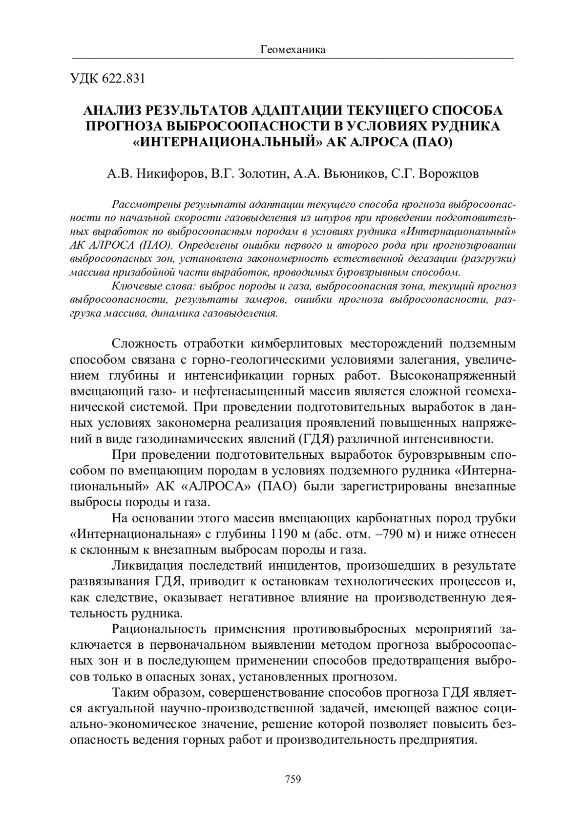 Рассмотрены результаты адаптации текущего способа прогноза выбросоопасности по начальной скорости газовыделения из шпуров при проведении подготовительных выработок по выбросоопасным породам в условиях рудника «Интернациональный» АК АЛРОСА (ПАО). Определены ошибки первого и второго рода при прогнозировании выбросоопасных зон, установлена закономерность естественной дегазации (разгрузки) массива призабойной части выработок, проводимых буровзрывным способом.