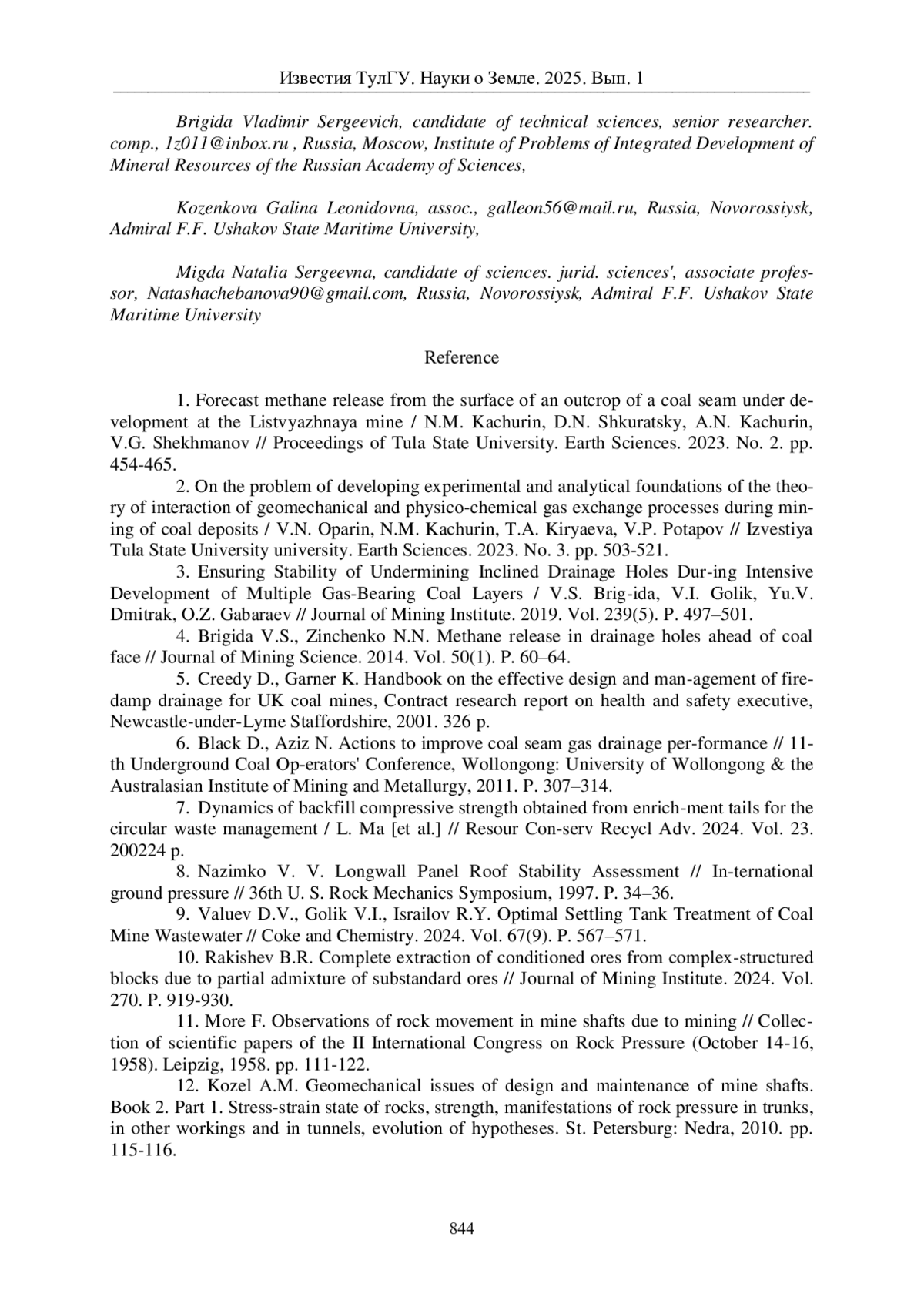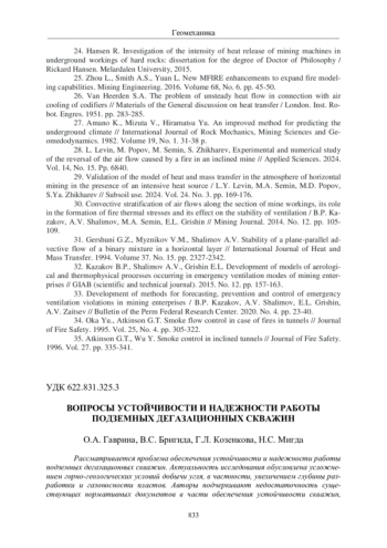 4. Brigida V.S., Zinchenko N.N. Methane release in drainage holes ahead of coal face // Journal of Mining Science. 2014. Vol. 50(1). P. 60-64. EDN: XMIYRP