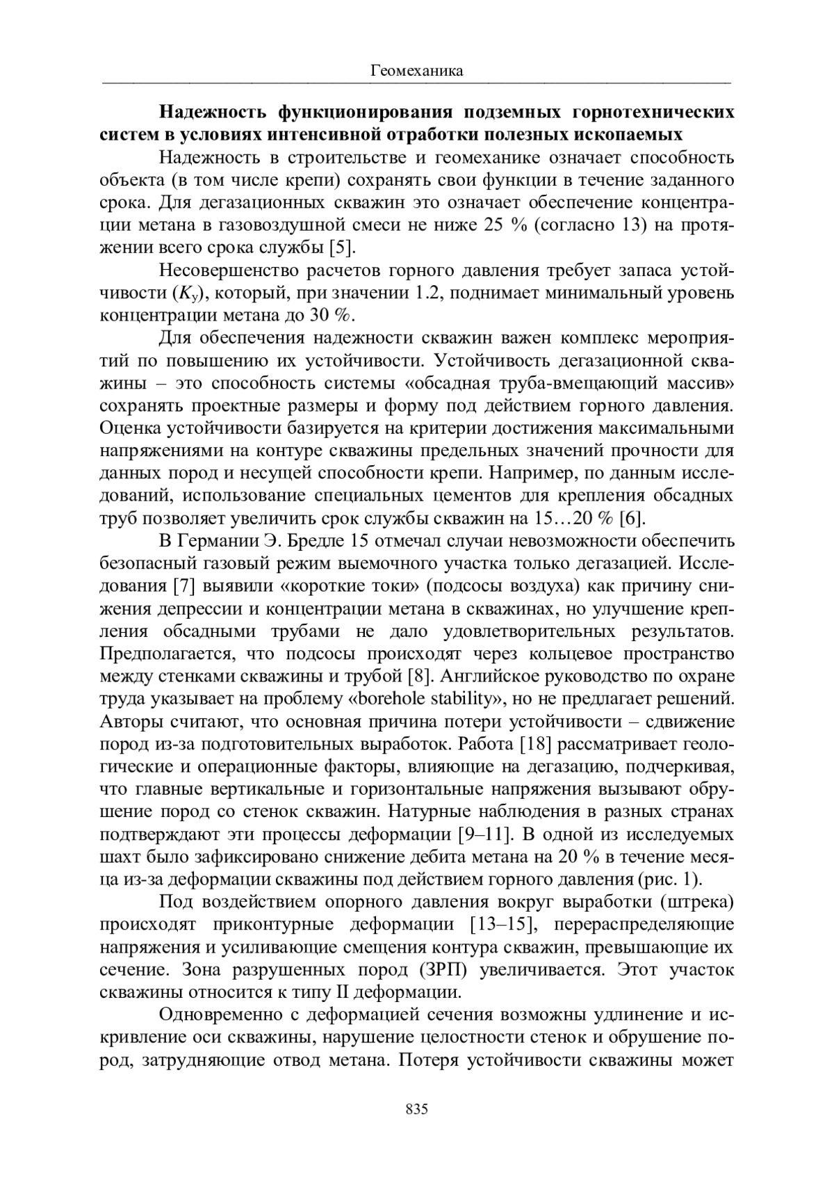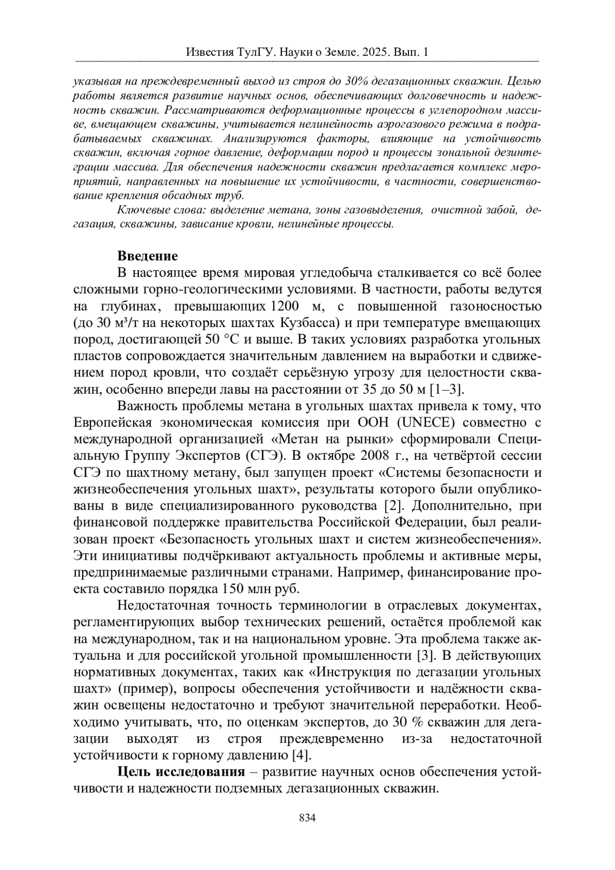 Рассматривается проблема обеспечения устойчивости и надежности работы подземных дегазационных скважин. Актуальность исследования обусловлена усложнением горно-геологических условий добычи угля, в частности, увеличением глубины разработки и газоносности пластов. Авторы подчеркивают недостаточность существующих нормативных документов в части обеспечения устойчивости скважин, указывая на преждевременный выход из строя до 30% дегазационных скважин. Целью работы является развитие научных основ, обеспечивающих долговечность и надежность скважин. Рассматриваются деформационные процессы в углепородном массиве, вмещающем скважины, учитывается нелинейность аэрогазового режима в подрабатываемых скважинах. Анализируются факторы, влияющие на устойчивость скважин, включая горное давление, деформации пород и процессы зональной дезинтеграции массива. Для обеспечения надежности скважин предлагается комплекс мероприятий, направленных на повышение их устойчивости, в частности, совершенствование крепления обсадных труб.