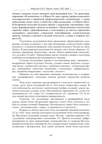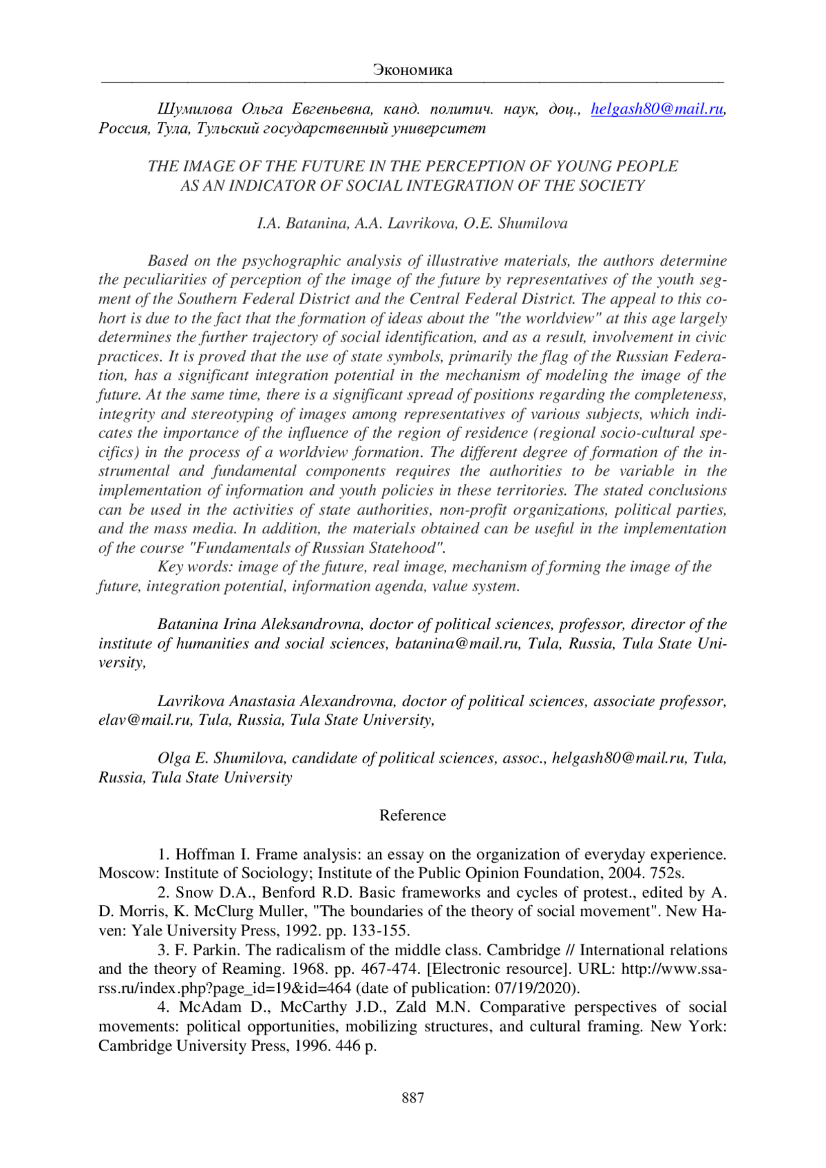 7. Домбровская А.Ю., Огнев А.С. Измерение образа будущего Российской Федерации в сознании российской молодежи: когнитивистика и киберметрия в прикладном политическом исследовании // Гуманитарные науки. 2023. №13(3). С.128-134.