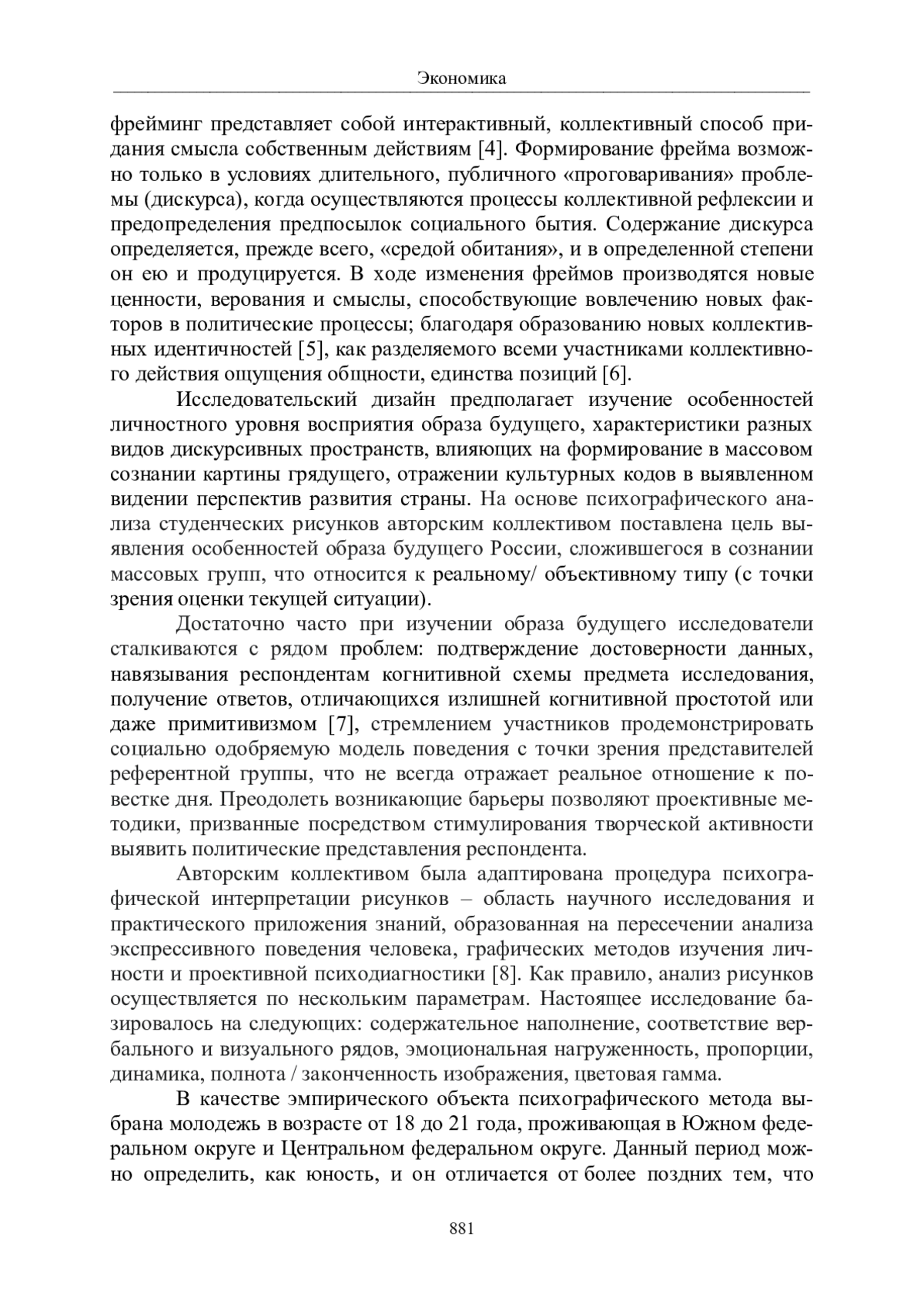 На основе психографического анализа иллюстративных материалов авторским коллективом определяются особенности восприятия образа будущего представителями молодежного сегмента Южного федерального округа и Центрального федерального округа. Обращение к данной когорте обусловлено тем, что формирование в этом возрасте представлений о «картине мира», во многом определяют дальнейшую траекторию социальной идентификации, и как следствие включенность в гражданские практики. Доказано, что существенным интеграционным потенциалом в механизме моделирования образа будущего обладает использование государственных символов, прежде всего флага Российского Федерации. Вместе с тем наблюдается существенный разброс позиций применительно наполненности, целостности и стереотипизированности образов среди представителей различных субъектов, что указывает на значимость влияния региона проживания (региональной социокультурной специфики) в процессе формирования картины мира. Разная степень сформированности инструментальной и фундаментальной составляющих требует от властных структур вариативность в реализации информационной и молодежной политик на указанных территориях. Изложенные выводы могут быть использованы в деятельности государственных органов власти, некоммерческих организаций, политических партий, средств массовой информации. Кроме того, полученные материалы могут быть полезны при реализации курса «Основы российской государственности».