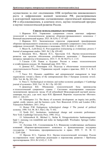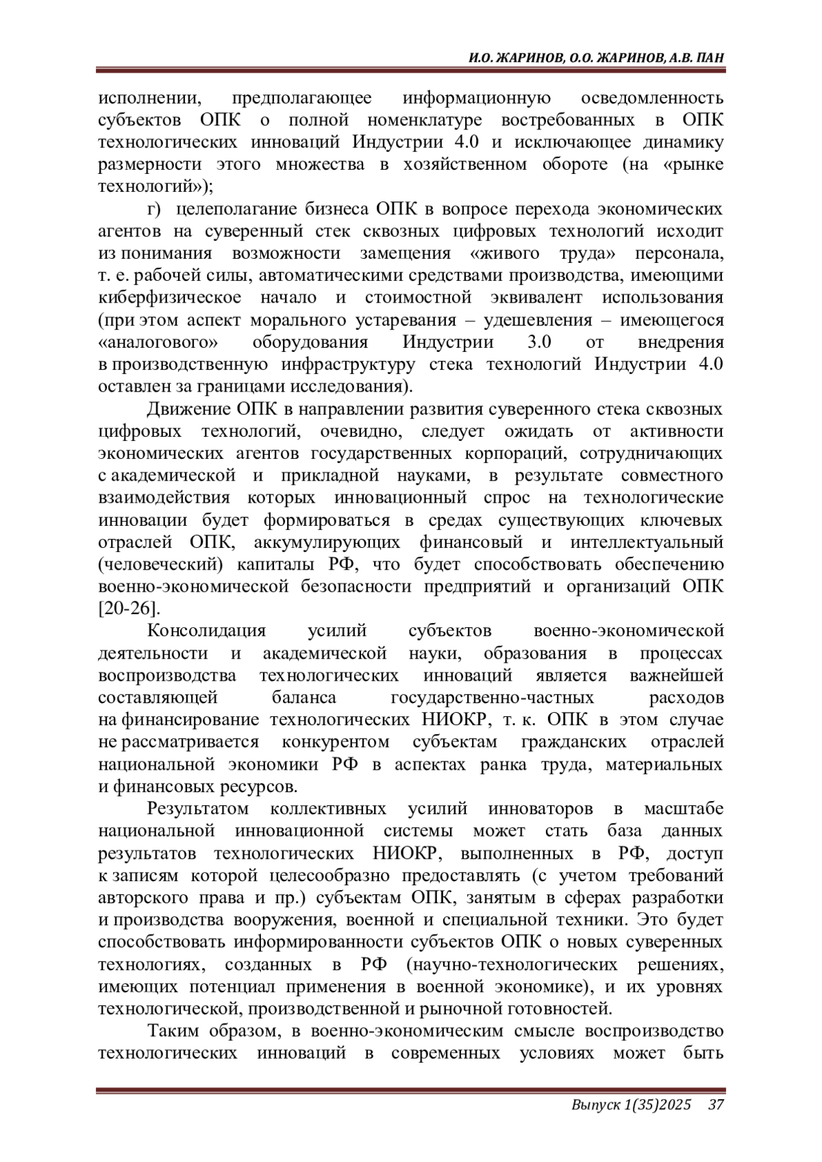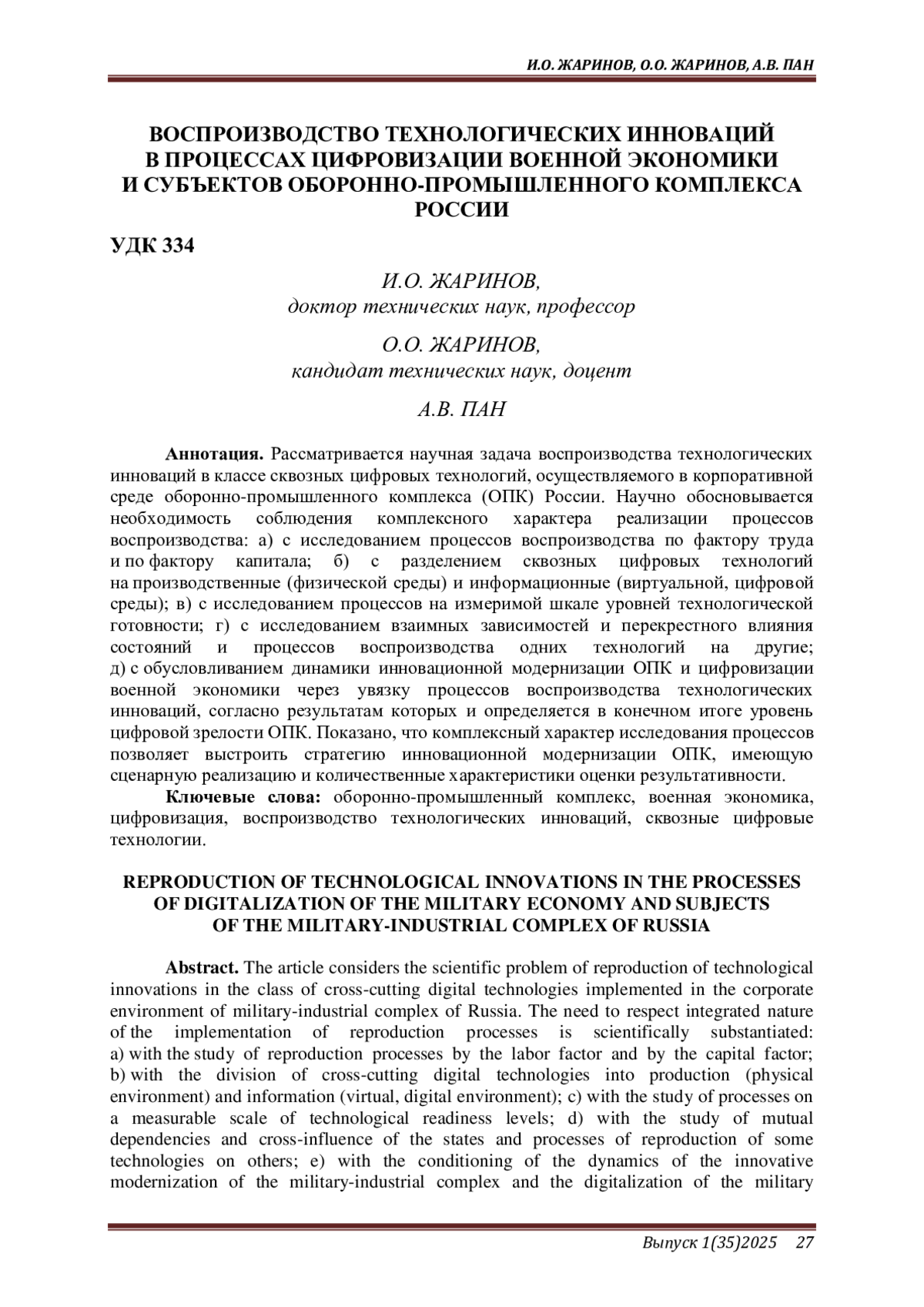 1. Жаринов И.О. Управление суверенным стеком сквозных цифровых технологий в технологическом развитии оборонно-промышленного комплекса // Военный академический журнал. 2023. № 3(39). C. 97-107. EDN: JCCPBD