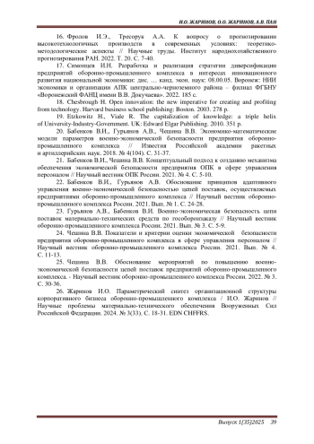 17. Симонцев И.Н. Разработка и реализация стратегии диверсификации предприятий оборонно-промышленного комплекса в интересах инновационного развития национальной экономики: дис. … канд. экон. наук: 08.00.05. Воронеж: НИИ экономики и организации АПК центрально-черноземного района - филиал ФГБНУ “Воронежский ФАНЦ имени В.В. Докучаева”. 2022. 185 с. EDN: WGTNJI