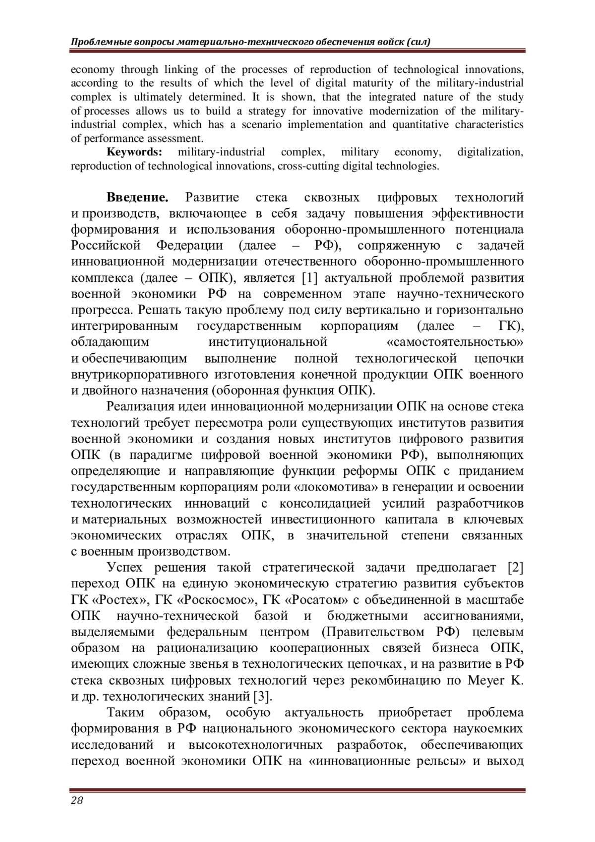 Рассматривается научная задача воспроизводства технологических инноваций в классе сквозных цифровых технологий, осуществляемого в корпоративной среде оборонно-промышленного комплекса (ОПК) России. Научно обосновывается необходимость соблюдения комплексного характера реализации процессов воспроизводства: а) с исследованием процессов воспроизводства по фактору труда и по фактору капитала; б) с разделением сквозных цифровых технологий на производственные (физической среды) и информационные (виртуальной, цифровой среды); в) с исследованием процессов на измеримой шкале уровней технологической готовности; г) с исследованием взаимных зависимостей и перекрестного влияния состояний и процессов воспроизводства одних технологий на другие; д) с обусловливанием динамики инновационной модернизации ОПК и цифровизации военной экономики через увязку процессов воспроизводства технологических инноваций, согласно результатам которых и определяется в конечном итоге уровень цифровой зрелости ОПК. Показано, что комплексный характер исследования процессов позволяет выстроить стратегию инновационной модернизации ОПК, имеющую сценарную реализацию и количественные характеристики оценки результативности.