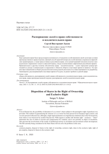 Еще в римском праве была предусмотрена возможность отчуждения сособственником своей доли (при условии преимущественного права покупки). Данный способ гарантий интересов сособственника сохранился в европейских правопорядках; а также присутствовал в российском праве, хотя единый правовой механизм получил законодательное закрепление только в советский период, откуда позаимствован современным российским правом. Применительно к другому полному абсолютному праву – исключительному – «доля» определяет размер притязаний на доходы и компенсацию за нарушение и объектом оборота в настоящее время не является. Это препятствует вовлечению в оборот результатов интеллектуальной деятельности и инвестированию в их разработку. Законопроект, рассматриваемый в настоящее время в Госдуме, не решит проблем в данной сфере.