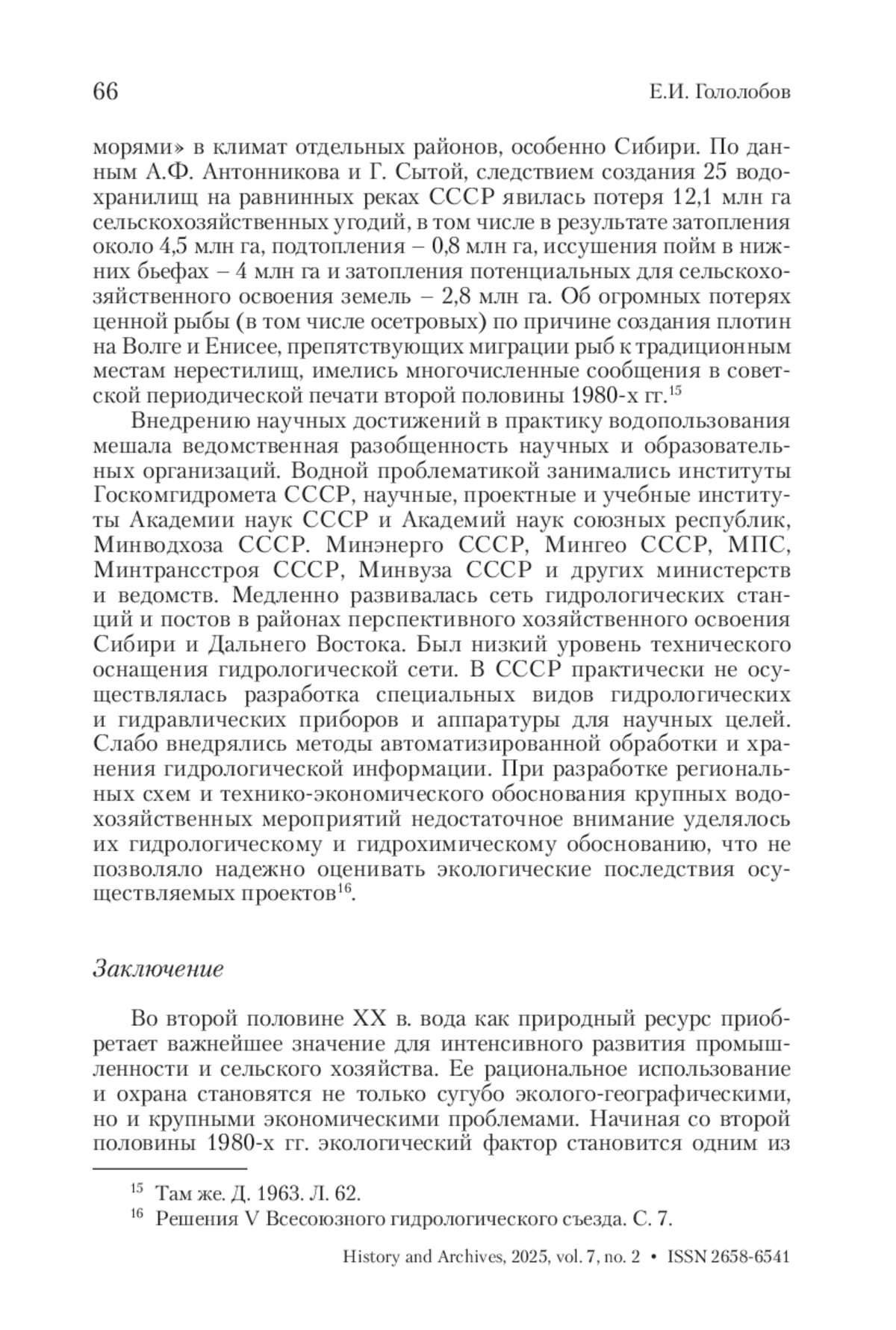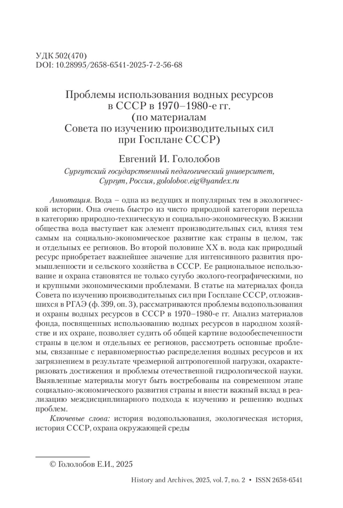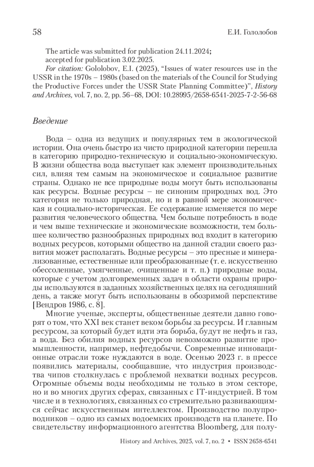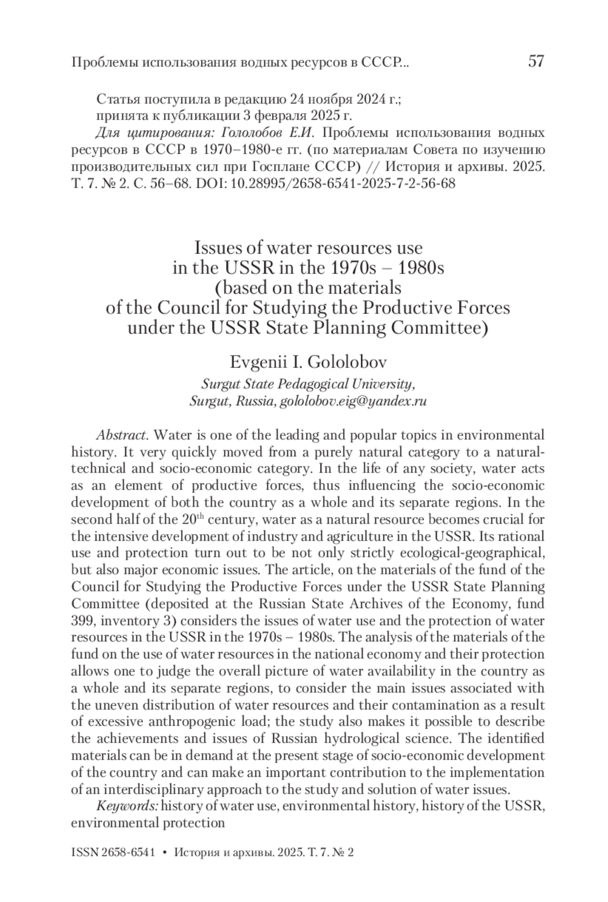 Вода – одна из ведущих и популярных тем в экологической истории. Она очень быстро из чисто природной категории перешла в категорию природно-техническую и социально-экономическую. В жизни общества вода выступает как элемент производительных сил, влияя тем самым на социально-экономическое развитие как страны в целом, так и отдельных ее регионов. Во второй половине XX в. вода как природный ресурс приобретает важнейшее значение для интенсивного развития промышленности и сельского хозяйства в СССР. Ее рациональное использование и охрана становятся не только сугубо эколого-географическими, но и крупными экономическими проблемами. В статье на материалах фонда Совета по изучению производительных сил при Госплане СССР, отложившихся в РГАЭ (ф. 399, оп. 3), рассматриваются проблемы водопользования и охраны водных ресурсов в СССР в 1970–1980‑е гг. Анализ материалов фонда, посвященных использованию водных ресурсов в народном хозяйстве и их охране, позволяет судить об общей картине водообеспеченности страны в целом и отдельных ее регионов, рассмотреть основные проблемы, связанные с неравномерностью распределения водных ресурсов и их загрязнением в результате чрезмерной антропогенной нагрузки, охарактеризовать достижения и проблемы отечественной гидрологической науки. Выявленные материалы могут быть востребованы на современном этапе социально-экономического развития страны и внести важный вклад в реализацию междисциплинарного подхода к изучению и решению водных проблем.