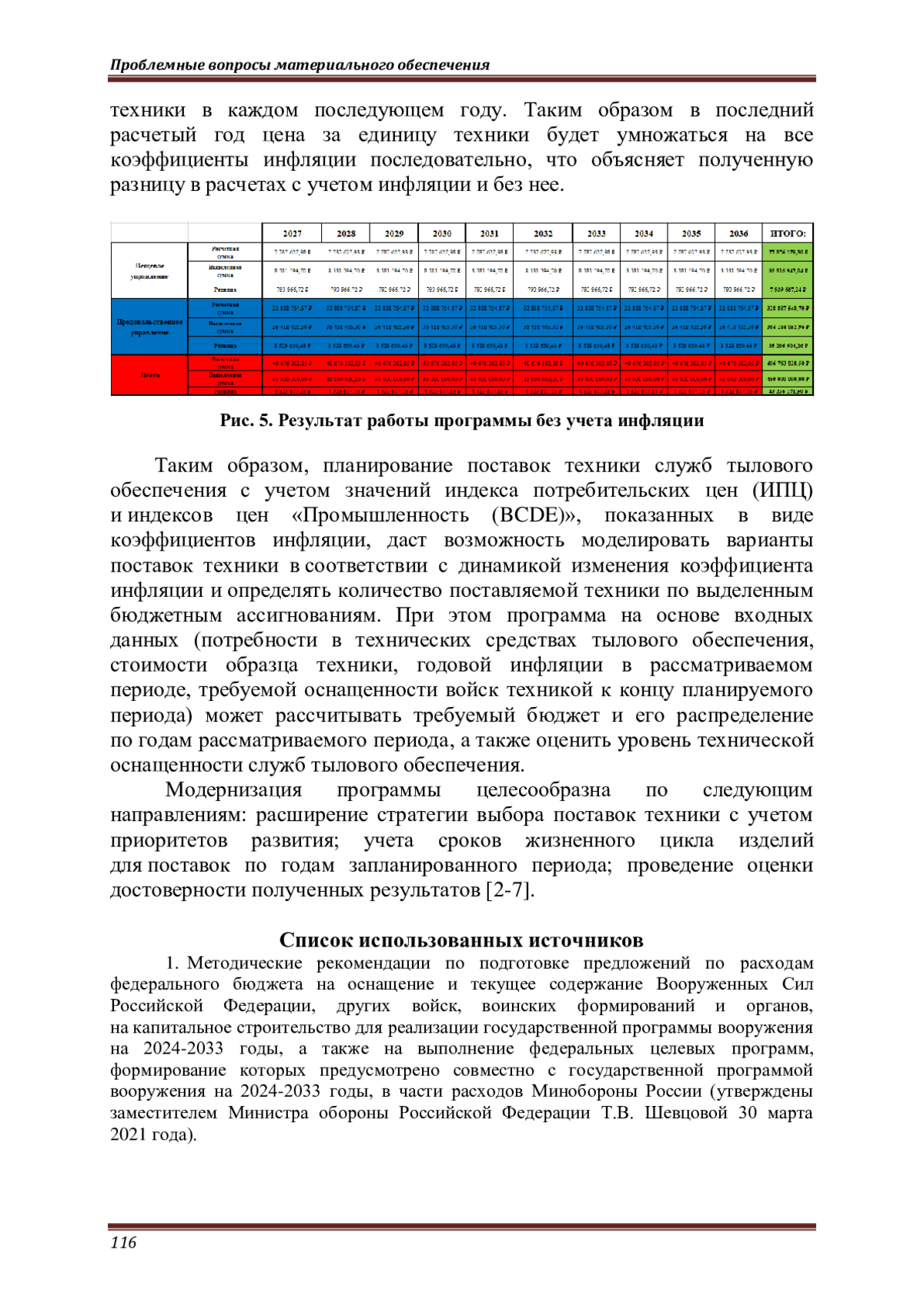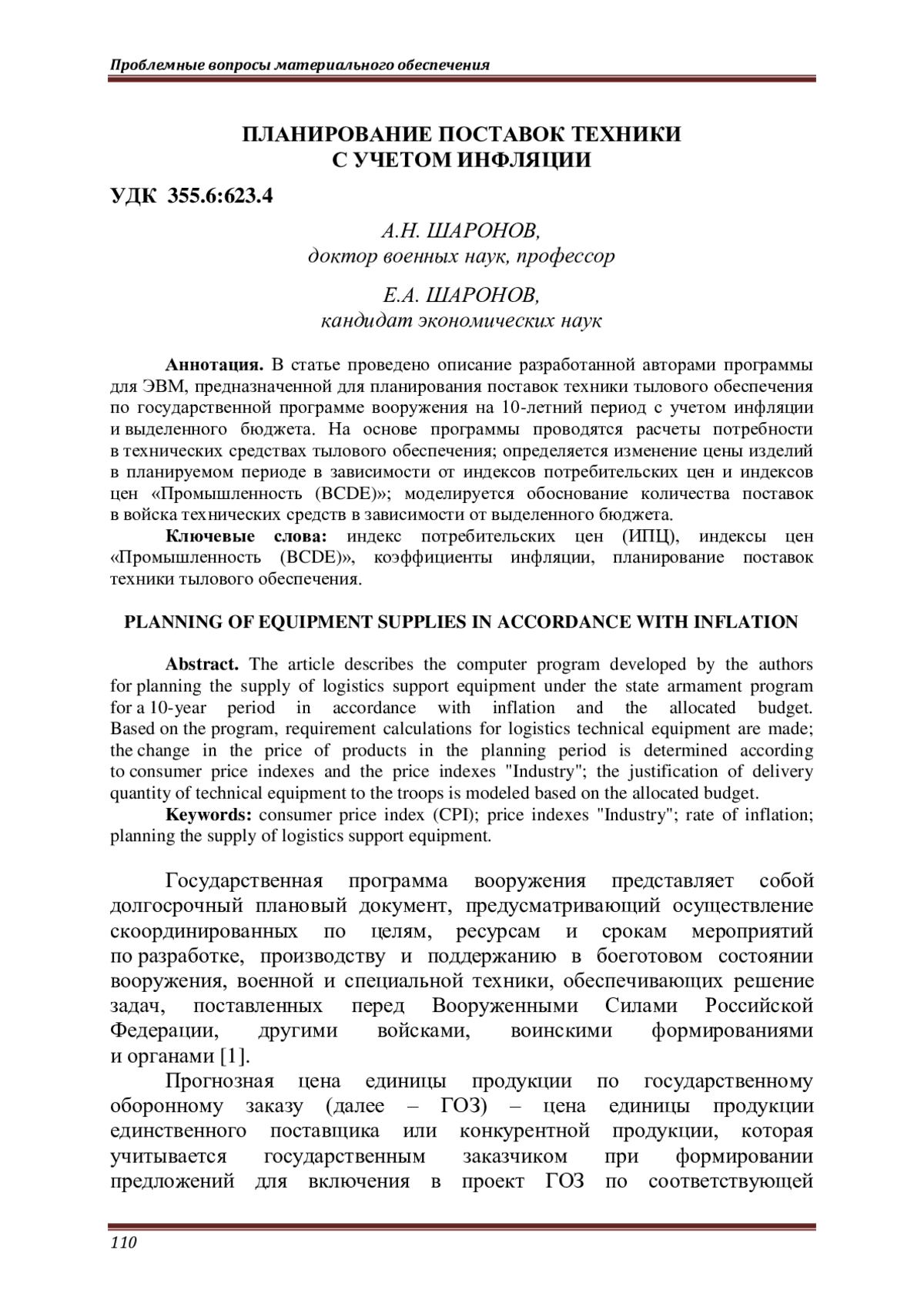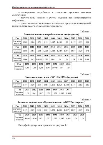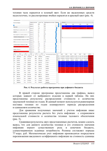 В статье проведено описание разработанной авторами программы для ЭВМ, предназначенной для планирования поставок техники тылового обеспечения по государственной программе вооружения на 10-летний период с учетом инфляции и выделенного бюджета. На основе программы проводятся расчеты потребности в технических средствах тылового обеспечения; определяется изменение цены изделий в планируемом периоде в зависимости от индексов потребительских цен и индексов цен «Промышленность (BCDE)»; моделируется обоснование количества поставок в войска технических средств в зависимости от выделенного бюджета.