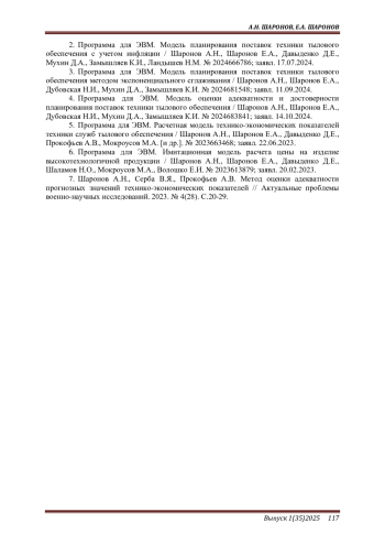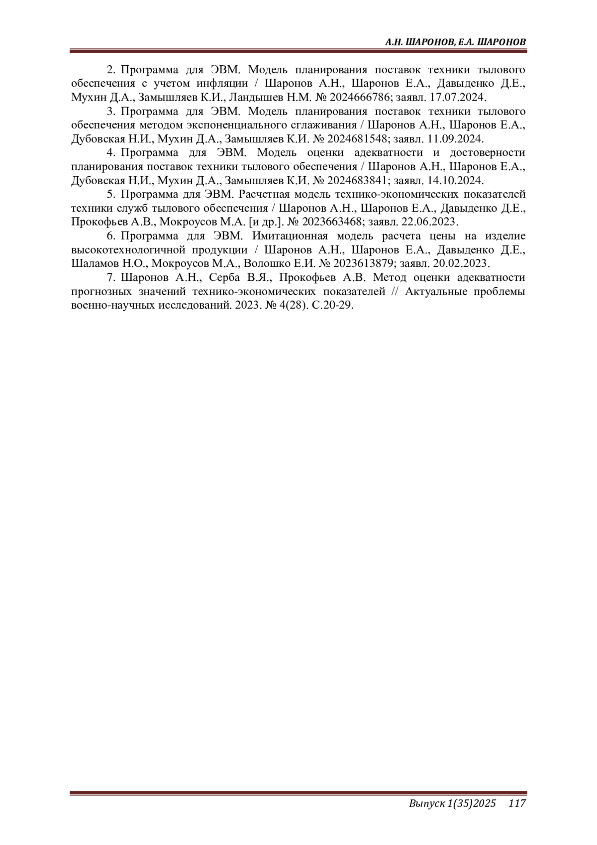 2. Программа для ЭВМ. Модель планирования поставок техники тылового обеспечения с учетом инфляции / Шаронов А.Н., Шаронов Е.А., Давыденко Д.Е., Мухин Д.А., Замышляев К.И., Ландышев Н.М. № 2024666786; заявл. 17.07.2024.