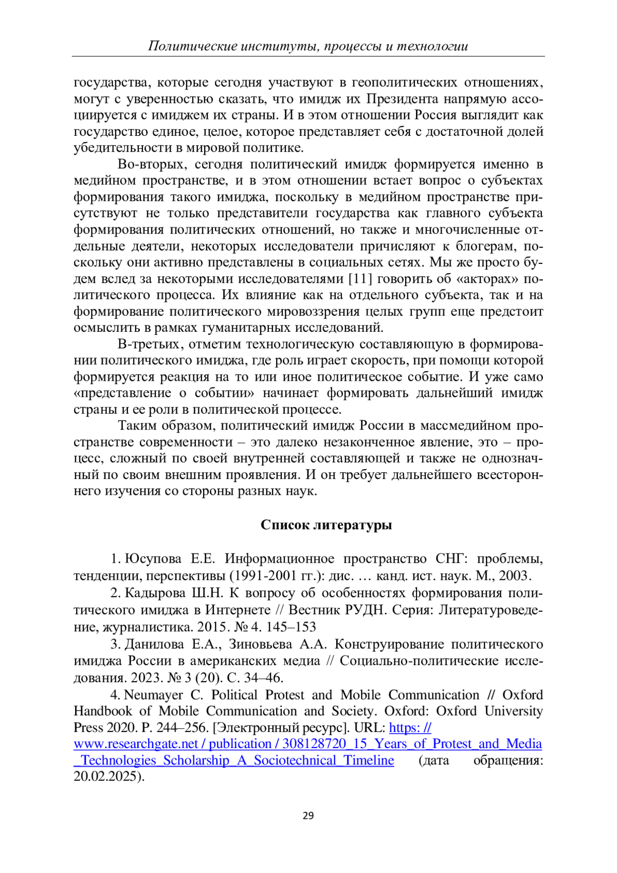 3. Данилова Е.А., Зиновьева А.А. Конструирование политического имиджа России в американских медиа // Социально-политические исследования. 2023. № 3 (20). С. 34-46. EDN: VUKYNH
