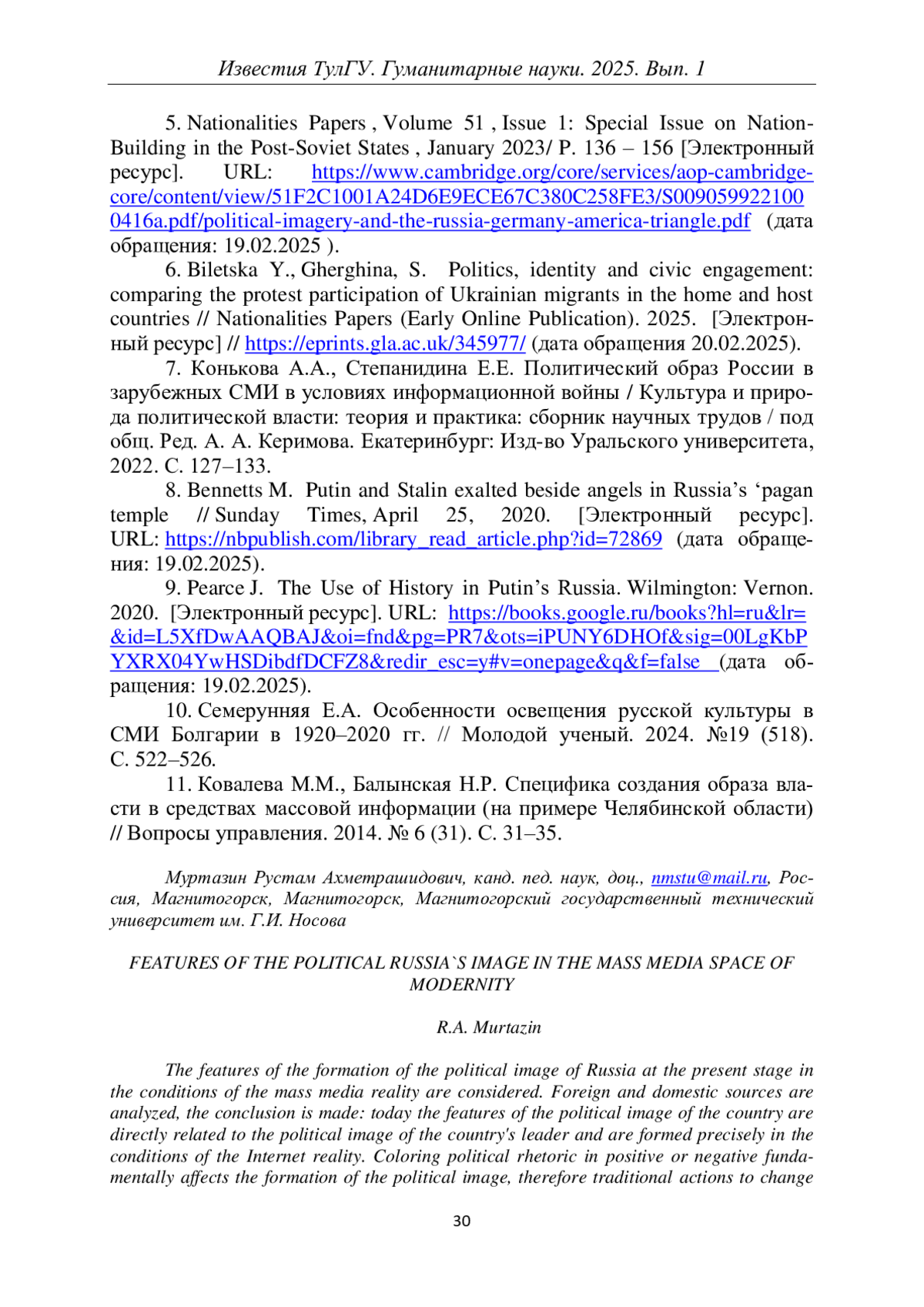 7. Конькова А.А., Степанидина Е.Е. Политический образ России в зарубежных СМИ в условиях информационной войны / Культура и природа политической власти: теория и практика: сборник научных трудов / под общ. Ред. А. А. Керимова. Екатеринбург: Изд-во Уральского университета, 2022. С. 127-133. EDN: AQLWVM