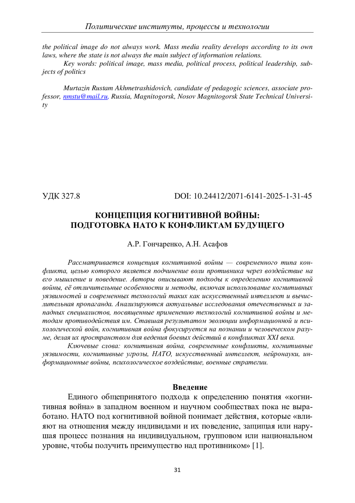 Рассматривается концепция когнитивной войны - современного типа конфликта, целью которого является подчинение воли противника через воздействие на его мышление и поведение. Авторы описывают подходы к определению когнитивной войны, её отличительные особенности и методы, включая использование когнитивных уязвимостей и современных технологий таких как искусственный интеллект и вычислительная пропаганда. Анализируются актуальные исследования отечественных и западных специалистов, посвященные применению технологий когнитивной войны и методам противодействия им. Ставшая результатом эволюции информационной и психологической войн, когнитивная война фокусируется на познании и человеческом разуме, делая их пространством для ведения боевых действий в конфликтах XXI века.