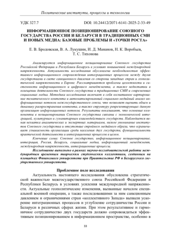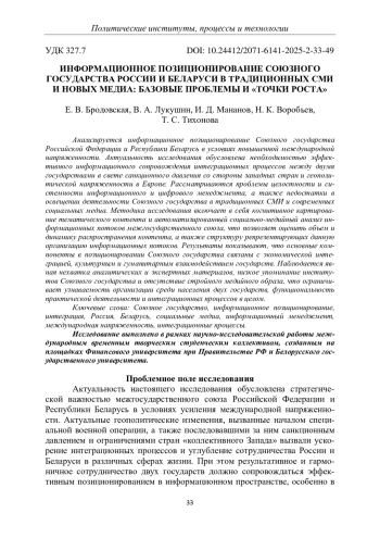 Анализируется информационное позиционирование Союзного государства Российской Федерации и Республики Беларусь в условиях повышенной международной напряженности. Актуальность исследования обусловлена необходимостью эффективного информационного сопровождения интеграционных процессов между двумя государствами в свете санкционного давления со стороны западных стран и геополитической напряженности в Европе. Рассматриваются проблемы целостности и системности информационного и цифрового менеджмента, а также недостатки в освещении деятельности Союзного государства в традиционных СМИ и современных социальных медиа. Методика исследования включает в себя когнитивное картирование тематического контента и автоматизированный социально-медийный анализ информационных потоков межгосударственного союза, что позволяет оценить объем и динамику распространения контента, а также структуру репрезентирующих данную организацию информационных потоков. Результаты показывают, что основные компоненты в позиционировании Союзного государства связаны с экономической интеграцией, культурным и гуманитарным взаимодействием государств. Наблюдается явная нехватка аналитических и экспертных материалов, низкое упоминание институтов Союзного государства и отсутствие стройного медийного образа, что ограничивает узнаваемость организации среди населения двух государств, функциональность практической деятельности и интеграционных процессов в целом.