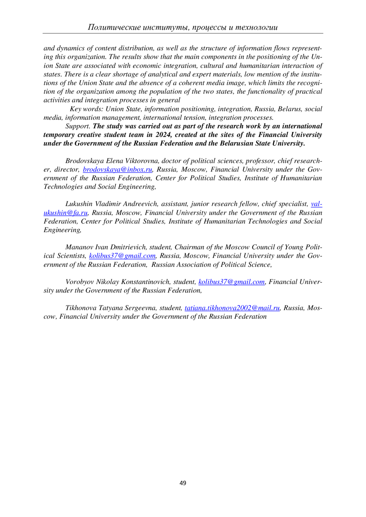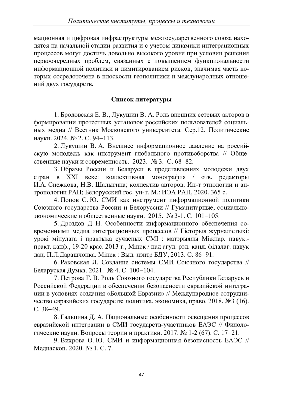 1. Бродовская Е. В., Лукушин В. А. Роль внешних сетевых акторов в формировании протестных установок российских пользователей социальных медиа // Вестник Московского университета. Сер.12. Политические науки. 2024. № 2. С. 94-113.