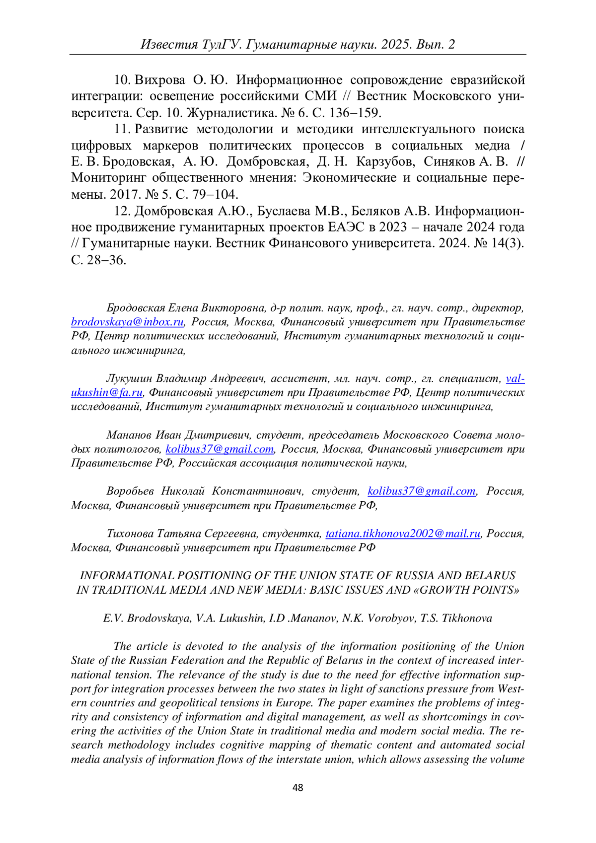 10. Вихрова О. Ю. Информационное сопровождение евразийской интеграции: освещение российскими СМИ // Вестник Московского университета. Сер. 10. Журналистика. № 6. С. 136-159.