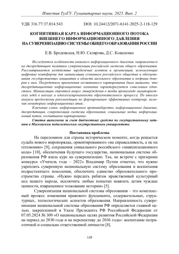 Исследуются особенности внешнего информационного давления, направленного на дискредитацию политики суверенизации российской системы общего образования. Рассматривается воздействие зарубежных агентов и организаций, использующих цифровые платформы для манипуляции сознанием российского общества и обесценивания государственных инициатив в области школьного образования и подрыва доверия к ним. Посредством применения когнитивного картирования было выявлено, что дискредитационные информационные кампании характеризуются смысловым единством. Манипуляции строятся вокруг утверждения о якобы пропаганде милитаристских идей в школах и идеологизированности образовательного процесса. По итогам анализа предложены рекомендации по формированию эффективных контрмер, включая мониторинг информационных атак.