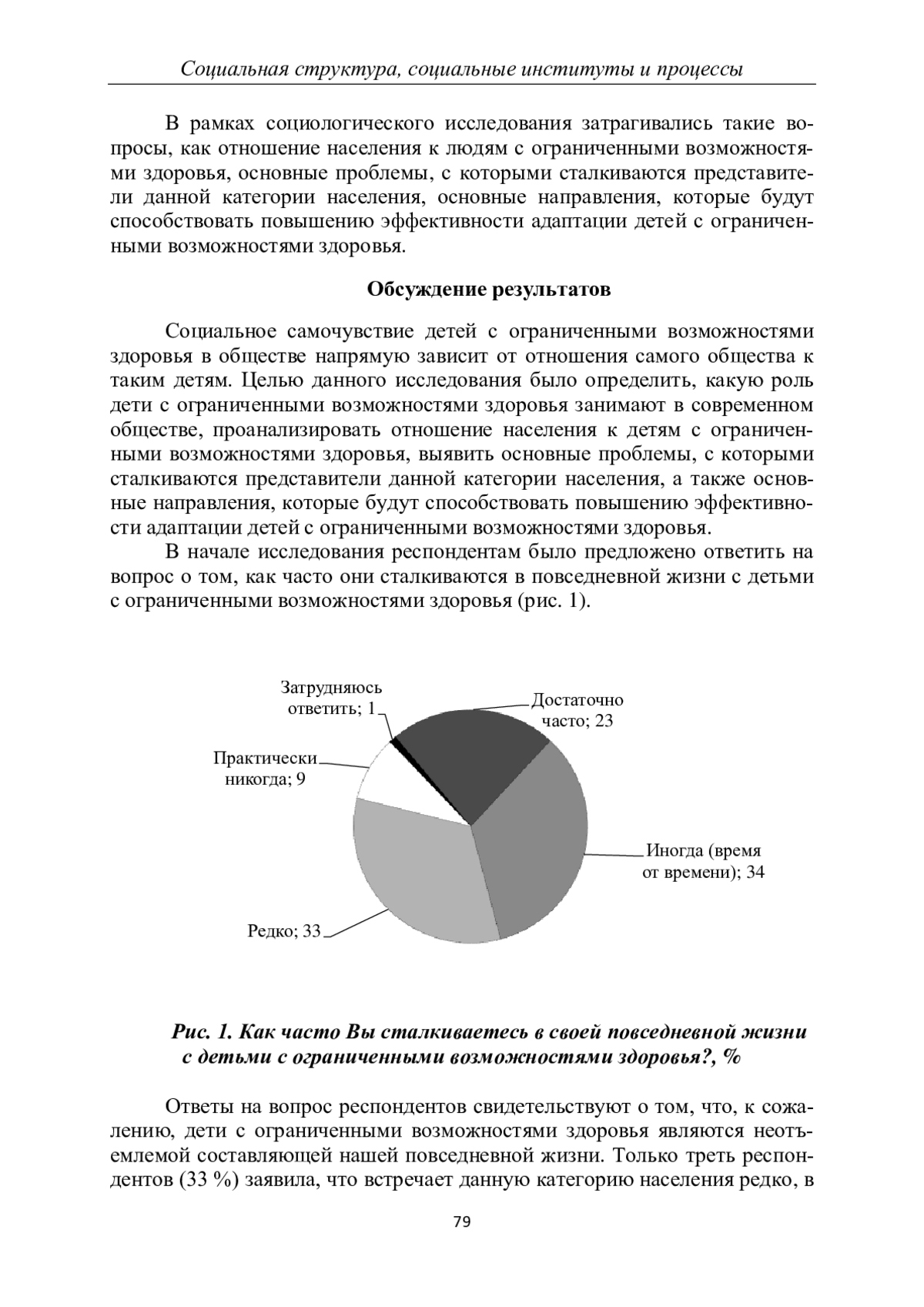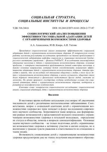 Проводится социологический анализ повышения эффективности социальной адаптации детей с ограниченными возможностями здоровья. В эмпирическую основу работы заложены результаты исследования, проведенного по данной проблематике в социологической лаборатории кафедры социологии и социальных технологий Среднерусского института управления - филиала РАНХиГС. В исследовании анализируются отношение населения к детям с ограниченными возможностями здоровья, основные проблемы, с которыми сталкиваются представители данной категории населения, а также основные направления, которые будут способствовать повышению эффективности адаптации детей с ограниченными возможностями здоровья. Авторы приходят к выводу, что за последний год отношение общества к людям, в том числе детям с ограниченными возможностями здоровья, в целом улучшилось, общество стало более терпимо относиться к физическим недостаткам других людей, уважать их личность. На уровне правового государства созданы необходимые условия для социальной адаптации детей с ограниченными возможностями здоровья, поддержки и развития их психофизических особенностей.