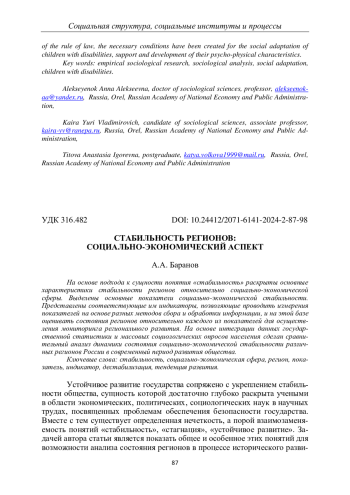 На основе подхода к сущности понятия «стабильность» раскрыты основные характеристики стабильности регионов относительно социально-экономической сферы. Выделены основные показатели социально-экономической стабильности. Представлены соответствующие им индикаторы, позволяющие проводить измерения показателей на основе разных методов сбора и обработки информации, и на этой базе оценивать состояния регионов относительно каждого из показателей для осуществления мониторинга регионального развития. На основе интеграции данных государственной статистики и массовых социологических опросов населения сделан сравнительный анализ динамики состояния социально-экономической стабильности различных регионов России в современный период развития общества.
