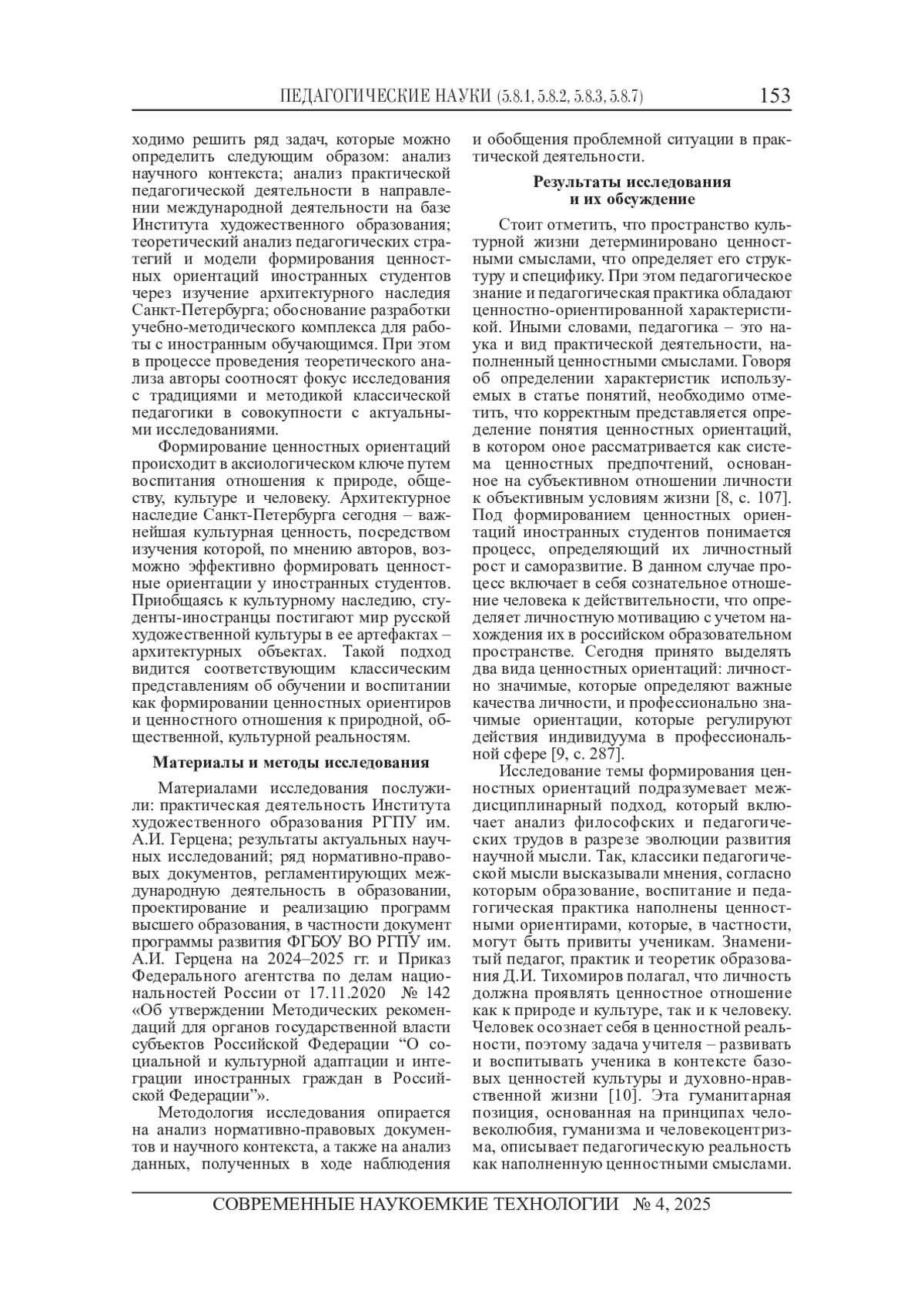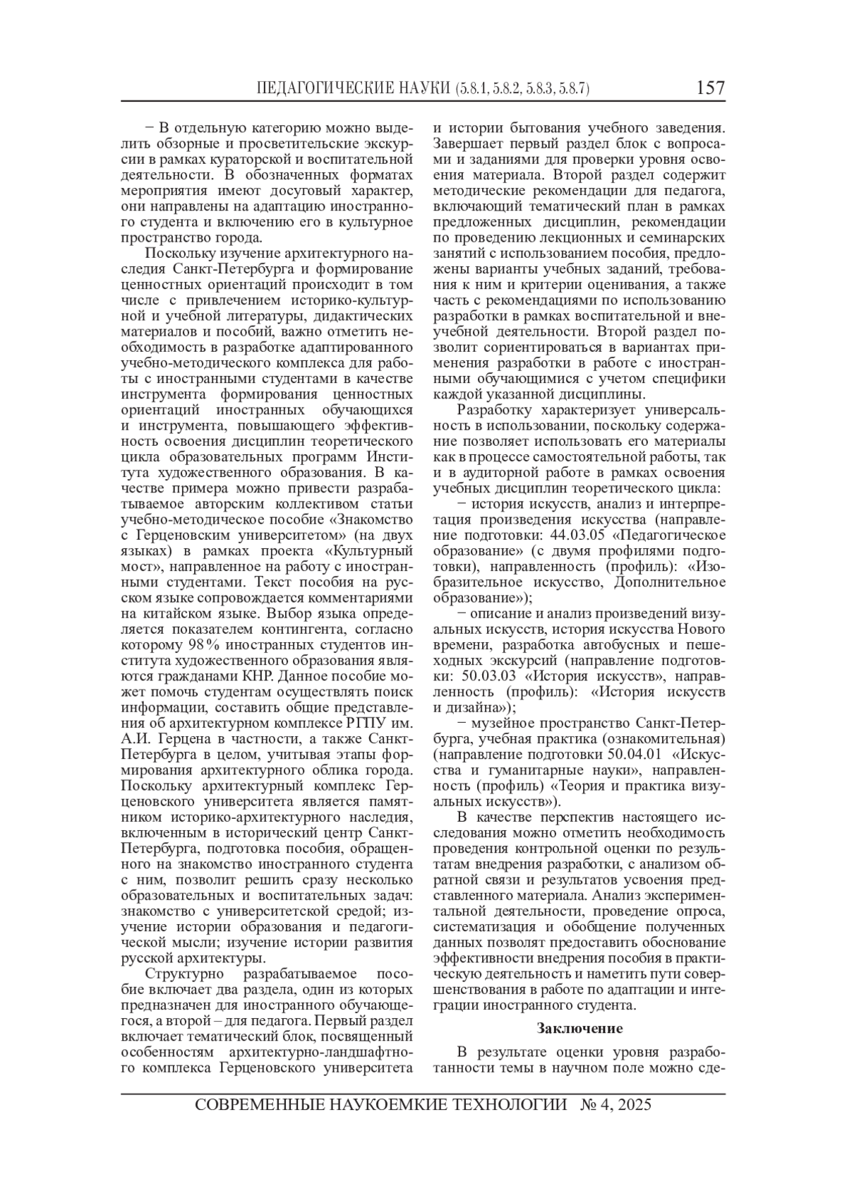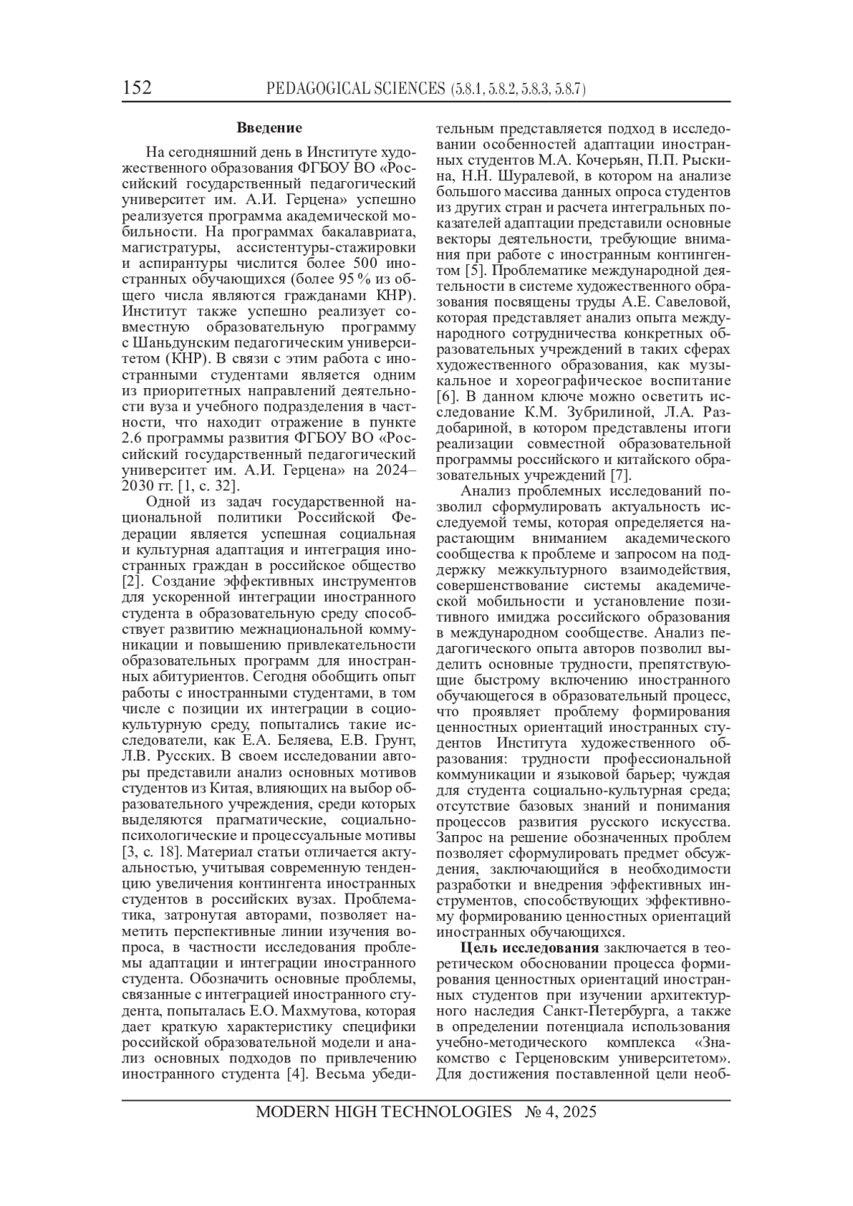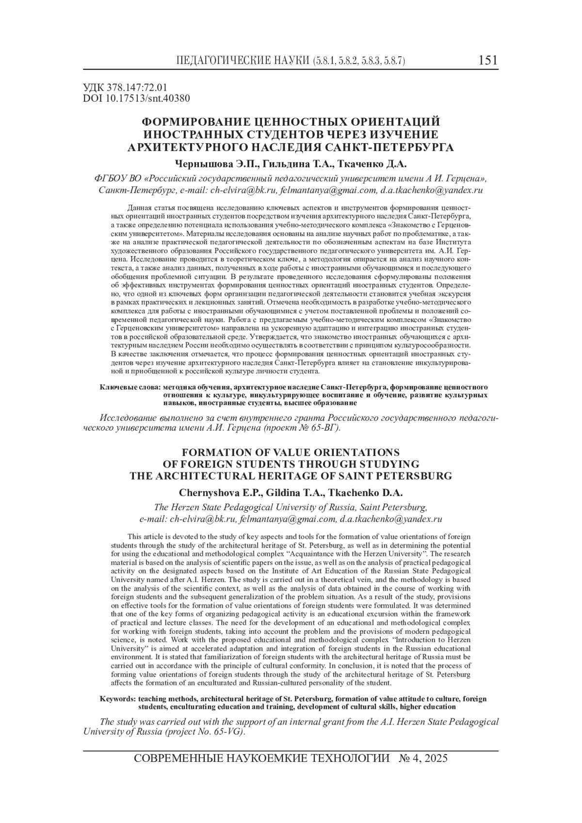 Данная статья посвящена исследованию ключевых аспектов и инструментов формирования ценностных ориентаций иностранных студентов посредством изучения архитектурного наследия Санкт-Петербурга, а также определению потенциала использования учебно-методического комплекса «Знакомство с Герценовским университетом». Материалы исследования основаны на анализе научных работ по проблематике, а также на анализе практической педагогической деятельности по обозначенным аспектам на базе Института художественного образования Российского государственного педагогического университета им. А. И. Герцена. Исследование проводится в теоретическом ключе, а методология опирается на анализ научного контекста, а также анализ данных, полученных в ходе работы с иностранными обучающимися и последующего обобщения проблемной ситуации. В результате проведенного исследования сформулированы положения об эффективных инструментах формирования ценностных ориентаций иностранных студентов. Определено, что одной из ключевых форм организации педагогической деятельности становится учебная экскурсия в рамках практических и лекционных занятий. Отмечена необходимость в разработке учебно-методического комплекса для работы с иностранными обучающимися с учетом поставленной проблемы и положений современной педагогической науки. Работа с предлагаемым учебно-методическим комплексом «Знакомство с Герценовским университетом» направлена на ускоренную адаптацию и интеграцию иностранных студентов в российской образовательной среде. Утверждается, что знакомство иностранных обучающихся с архитектурным наследием России необходимо осуществлять в соответствии с принципом культуросообразности. В качестве заключения отмечается, что процесс формирования ценностных ориентаций иностранных студентов через изучение архитектурного наследия Санкт-Петербурга влияет на становление инкультурированой и приобщенной к российской культуре личности студента.