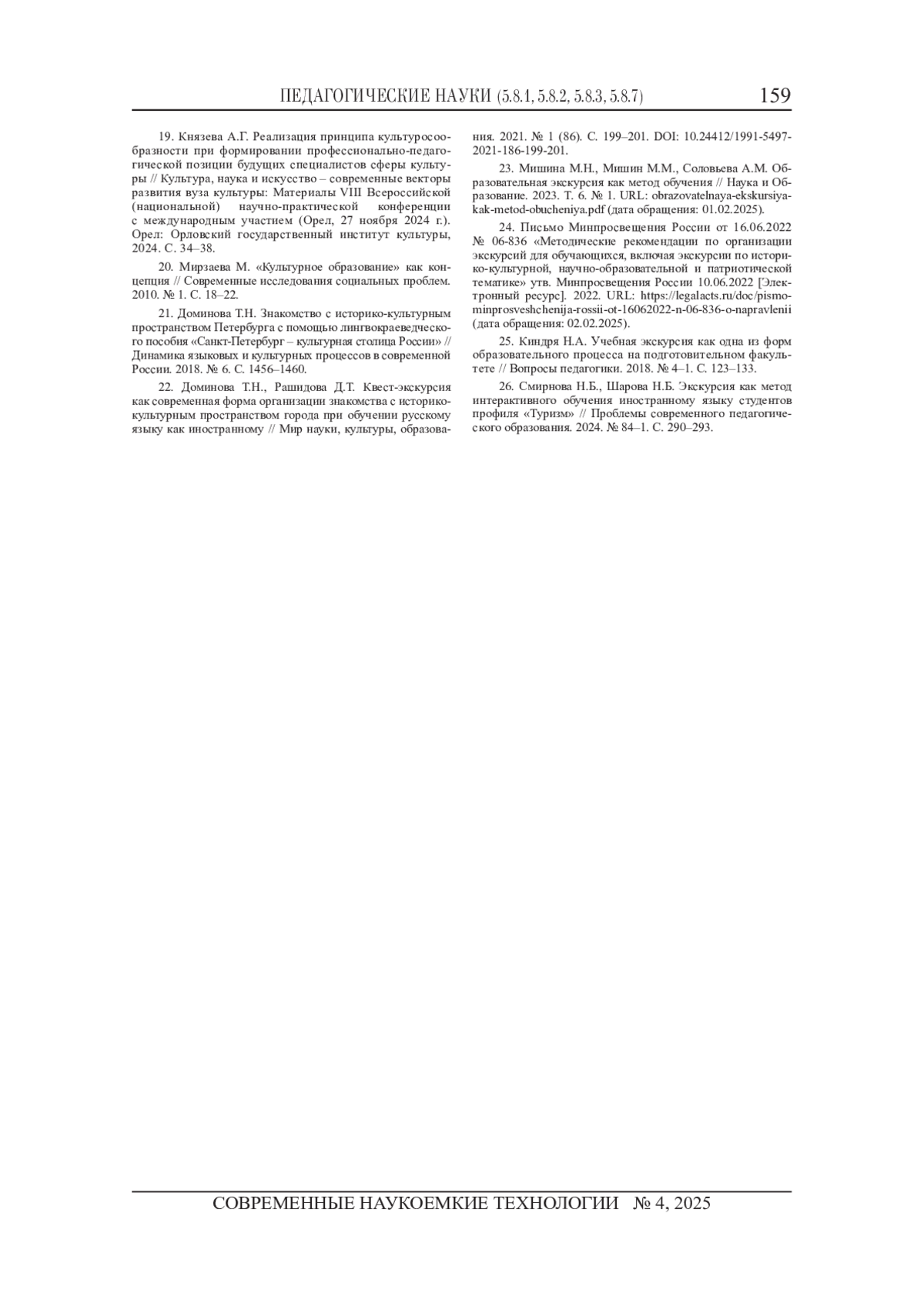 23. Мишина М.Н., Мишин М.М., Соловьева А.М. Образовательная экскурсия как метод обучения // Наука и Образование. 2023. Т. 6. № 1. URL: obrazovatelnaya-ekskursiya-kak-metod-obucheniya.pdf (дата обращения: 01.02.2025).