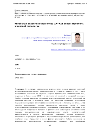 В настоящем исследовании анализируется процесс развития китайской академической оперы (далее - китайская опера) в XX-XXI вв., начиная с 1945 г. Фокус исследования направлен на изучение оперных произведений академического типа, созданных в Китае после 1945 г. в контексте её сюжетной и жанровой эволюции. Особое внимание уделяется построению классификационной модели, основанной на типологии сюжетов и жанровых форм, что позволяет преодолеть ограничения традиционных подходов, ориентированных исключительно на тематику или стиль. Автор подробно рассматривает оперные произведения различных этапов, а также художественно-исторические источники, прослеживая трансформацию парадигмы - от преобладания исторической тематики к формированию литературно ориентированного подхода, сосредоточенного на индивидуальном опыте, психологической выразительности и поэтике. Исследование раскрывает влияние социальных, политических и культурных факторов на художественные процессы и демонстрирует, как китайская опера обращается к новым формам драматургии. Работа направлена на формирование аналитического инструментария, полезного для зарубежных исследователей, стремящихся к глубокому пониманию специфики китайской оперной традиции в современной культурной среде. В исследовании используется метод сравнительно-типологического анализа, который включает идентификацию жанровых особенностей опер, анализ их сюжетной структуры и сопоставление с историческим контекстом. Основными выводами проведенного исследования является выявление закономерностей развития китайской оперы XX-XXI вв., в частности перехода от исторической тематики к литературно ориентированным сюжетам, что отражает изменения в социально-политическом и культурном контексте. Особым вкладом автора в исследование темы является разработка новой классификационной модели, основанной на жанровых типах и сюжетных структурах, позволяющей глубже понять внутренние механизмы эволюции произведений. Новизна исследования заключается в комплексном анализе взаимосвязей музыкальных, драматургических и социокультурных факторов, влияющих на трансформацию жанров и сюжетов, а также создании аналитического инструментария для зарубежных исследователей, способствующего системному и междисциплинарному изучению китайской оперы. Полученные результаты открывают новые перспективы для дальнейших исследований в области музыкальной и театральной культуры Китая.