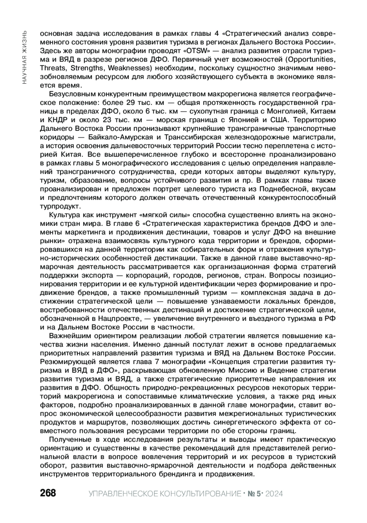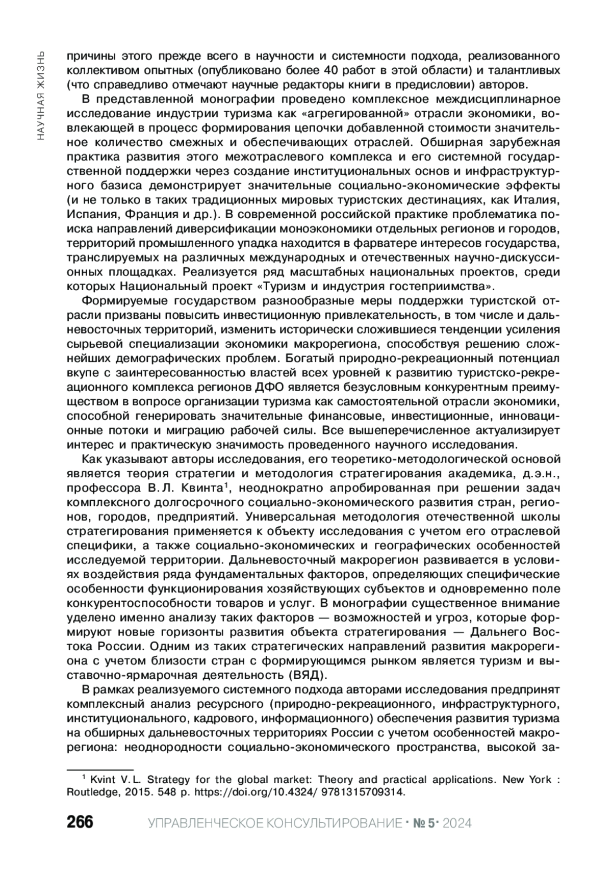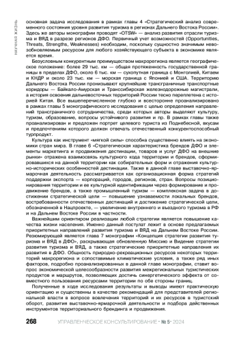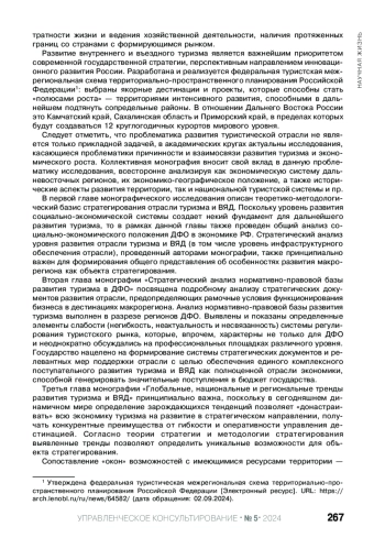Стратегирование туризма и выставочно-ярмарочной деятельности на Дальнем Востоке России: монография / И. З. Чхотуа, А. В. Садовничая, Л. И. Власюк, А. С. Хворостяная; под науч. ред. С. М. Дарькина, В. Л. Квинта. М.: Первое экономическое издательство, 2024. 406 с.: илл. (Библиотека «Стратегия Дальнего Востока России»). ISBN: 978-5-91292-518-4. DOI: 10.18334/9785912925184