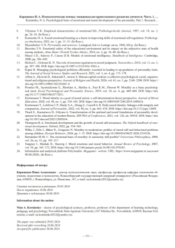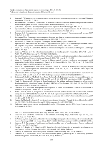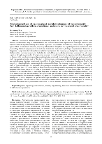 КОРНИЕНКО Н. А. ПСИХОЛОГИЧЕСКИЕ ОСНОВЫ ЭМОЦИОНАЛЬНО-НРАВСТВЕННОГО РАЗВИТИЯ ЛИЧНОСТИ. ЧАСТЬ 1. ИССЛЕДОВАТЕЛЬСКАЯ ПРОБЛЕМА ЭМОЦИОНАЛЬНО-НРАВСТВЕННОГО РАЗВИТИЯ ЛИЧНОСТИ // ПРОФЕССИОНАЛЬНОЕ ОБРАЗОВАНИЕ В СОВРЕМЕННОМ МИРЕ. 2024. Т. 14, № 3