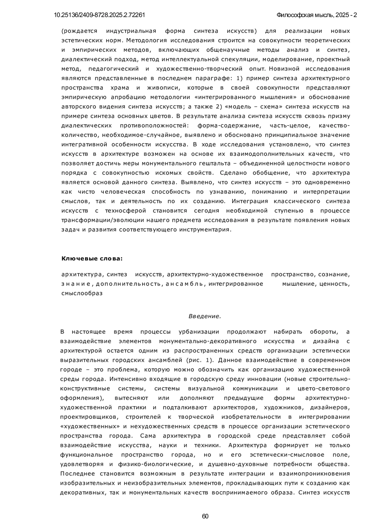 В статье исследуется феномен синтеза искусств, главным связующим в котором является архитектура (зодчество). Сама архитектура в городской среде представляет собой взаимодействие искусства, науки и техники. В качестве детерминанта классического синтеза искусств автор статьи полагает гармоничное соотношение логических связей и отношений в искусстве со связями и отношениями реального мира. Однако синтез искусств сегодня все чаще взаимодействует с техносферой. В этом кроются как соответствующие «угрозы и вызовы» (способность детерминировать эстетическую, психологическую, интеллектуальную и ценностную дезориентацию общественного сознания), так и широчайшие перспективы дальнейшего развития синтеза искусств. Сама эпоха несет новые эстетические возможности (рождается индустриальная форма синтеза искусств) для реализации новых эстетических норм. Методология исследования строится на совокупности теоретических и эмпирических методов, включающих общенаучные методы анализ и синтез, диалектический подход, метод интеллектуальной спекуляции, моделирование, проектный метод, педагогический и художественно-творческий опыт. Новизной исследования являются представленные в последнем параграфе: 1) пример синтеза архитектурного пространства храма и живописи, которые в своей совокупности представляют эмпирическую апробацию методологии «интегрированного мышления» и обоснование авторского видения синтеза искусств; а также 2) «модель - схема» синтеза искусств на примере синтеза основных цветов. В результате анализа синтеза искусств сквозь призму диалектических противоположностей: форма-содержание, часть-целое, качество-количество, необходимое-случайное, выявлено и обосновано принципиальное значение интегративной особенности искусства. В ходе исследования установлено, что синтез искусств в архитектуре возможен на основе их взаимодополнительных качеств, что позволяет достичь меры монументального гештальта - объединенной целостности нового порядка с совокупностью искомых свойств. Сделано обобщение, что архитектура является основой данного синтеза. Выявлено, что синтез искусств - это одновременно как чисто человеческая способность по узнаванию, пониманию и интерпретации смыслов, так и деятельность по их созданию. Интеграция классического синтеза искусств с техносферой становится сегодня необходимой ступенью в процессе трансформации/эволюции нашего предмета исследования в результате появления новых задач и развития соответствующего инструментария.