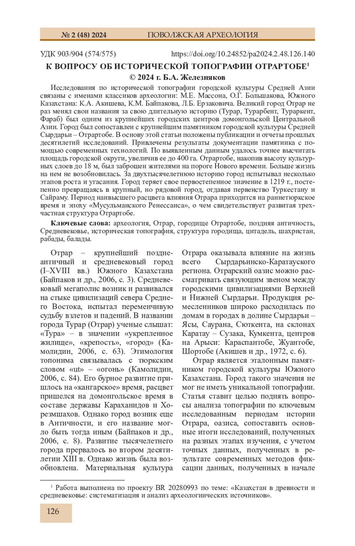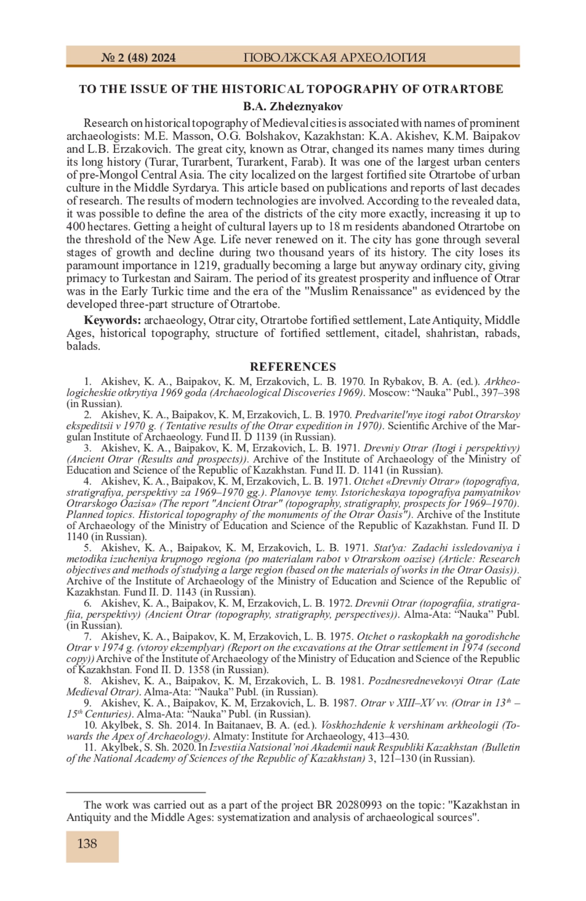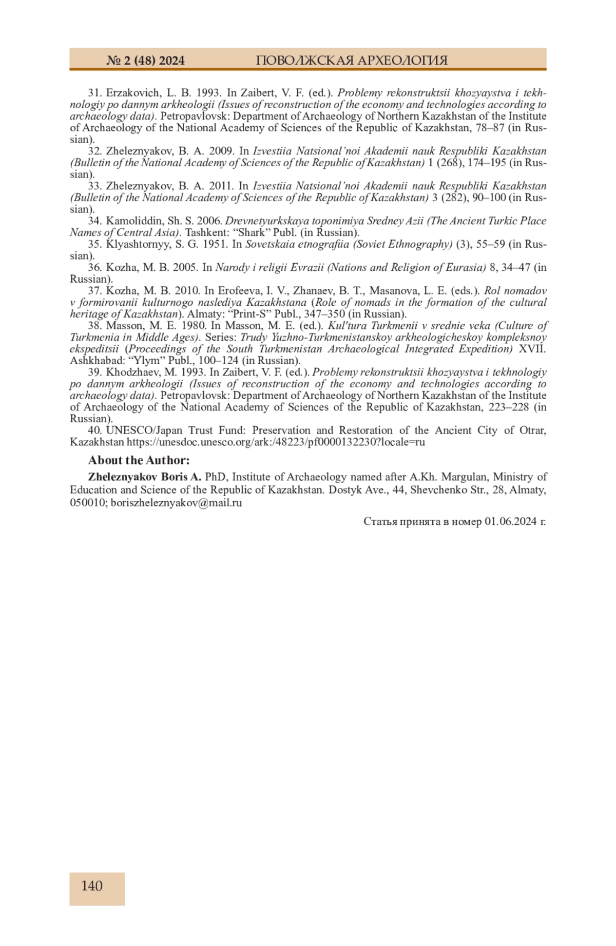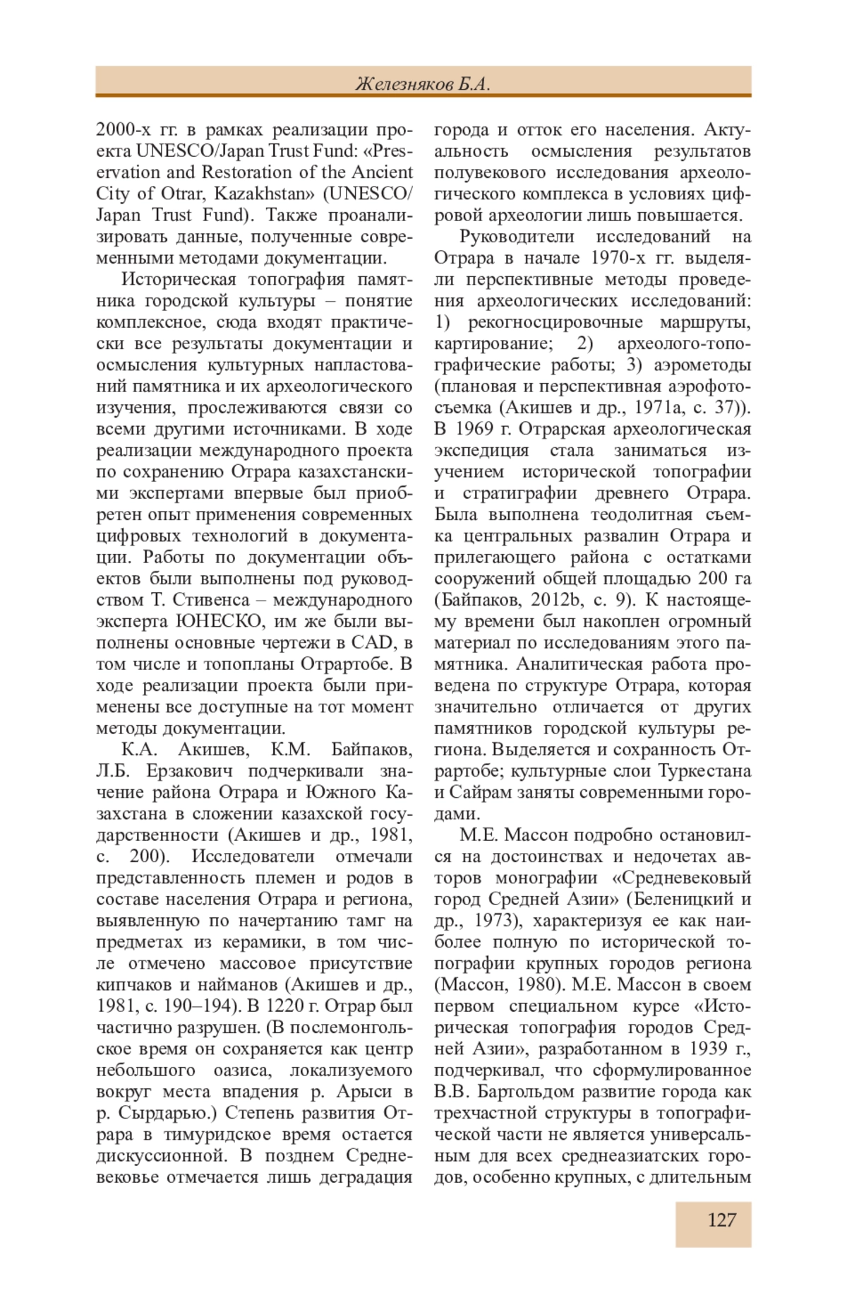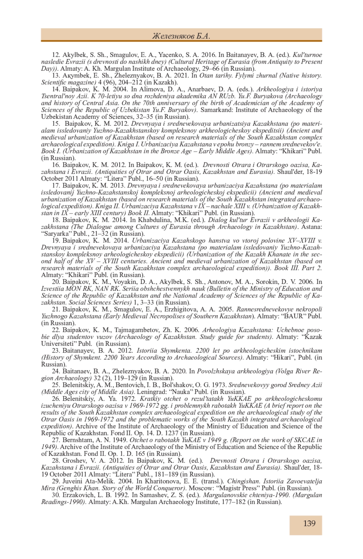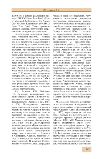 32. Железняков Б.А. Об особенностях формирования городских рабадов в IX-X вв. на юге Казахстана (городища с длинными стенами) // Известия НАН РК, МОН РК Сер. обществ. наук. 2009. № 1 (268). С. 174-195.