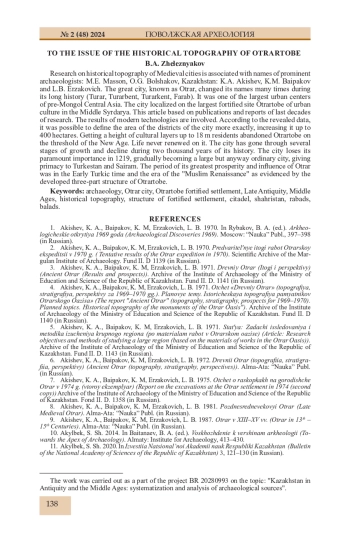 33. Железняков Б.А. К вопросу о датировке верхних слоев городища Жуантобе. // Известия НАН РК, МОН РК Сер. обществ. наук. 2011. № 3 (282). С. 90-100.