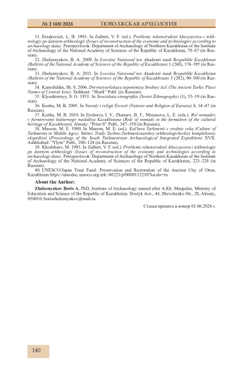24. Байтанаев Б.А., Железняков Б.А. Погребальные зороастрийские сосуды из Южного Казахстана // Поволжская археология. 2020. № 2 (32). С. 119-129. EDN: VMHWSS