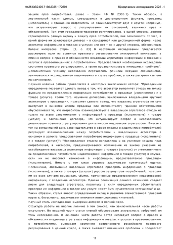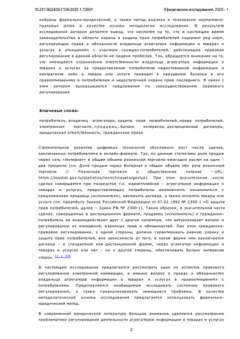 Развитие цифровых технологий и появление крупных интернет-платформ, позволяющих потребителям выбирать и приобретать товары и услуги, – агрегаторов информации о товарах и (или) услугах – делает актуальным вопрос о регулировании деятельности указанных субъектов именно в аспекте их взаимодействия с потребителями. Не секрет, что при заключении договора купли-продажи или возмездного оказания услуг при посредстве агрегатора информации потребитель не взаимодействует напрямую с продавцом или исполнителем, полагаясь лишь на ту информацию о контрагенте или о товаре (услуге), которую предоставляет агрегатор информации, что неизбежно ставит вопрос о роли владельца такого агрегатора в правоотношениях с участием потребителей, его правах и обязанностях, а также о пределах его ответственности за нарушение прав потребителей. Автором работы избраны формально-юридический, а также метод анализа и толкования нормативно-правовых актов в качестве основы методологии исследования. В результате исследования автором делается вывод, что несмотря на то, что в настоящее время законодательство в области охраны и защиты прав потребителей содержит ряд норм, регулирующих права и обязанности владельца агрегатора информации о товарах и услугах в отношениях с участием граждан-потребителей, действующее правовое регулирование в данной области не лишено пробелов. Так, обращается внимание на то, что имеющееся ограничение ответственности владельца агрегатора информации о товарах и услугах за предоставление потребителю недостоверной информации о контрагенте либо о товаре или услуге приводит к нарушению баланса в его правоотношениях в потребителем и недостаточной охране прав последнего. В связи с этим автором высказываются предложения по совершенствованию правового регулирования.