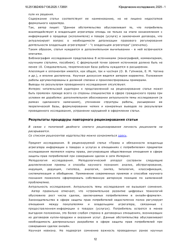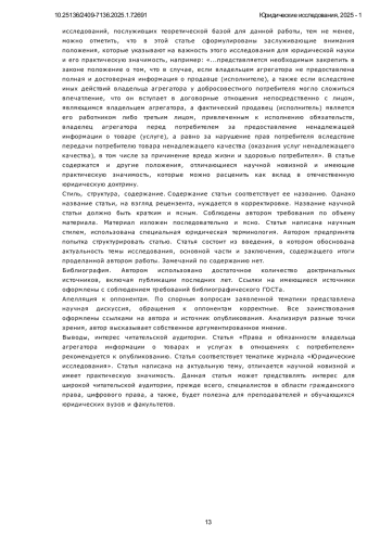 6. Кузнецова Н.Г. Правовое положение агрегатора информации о товарах (услугах, работах, цифровом контенте) и его преддоговорные обязанности // Юридические исследования. 2018. № 3. С.1-15.