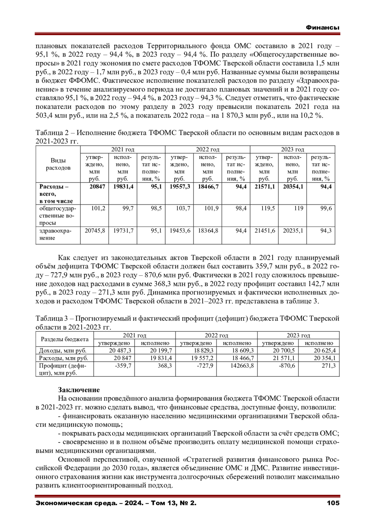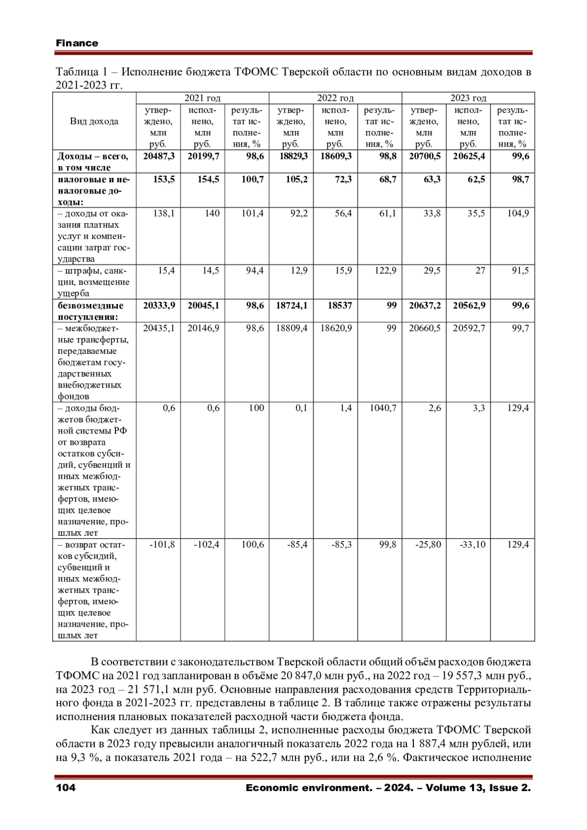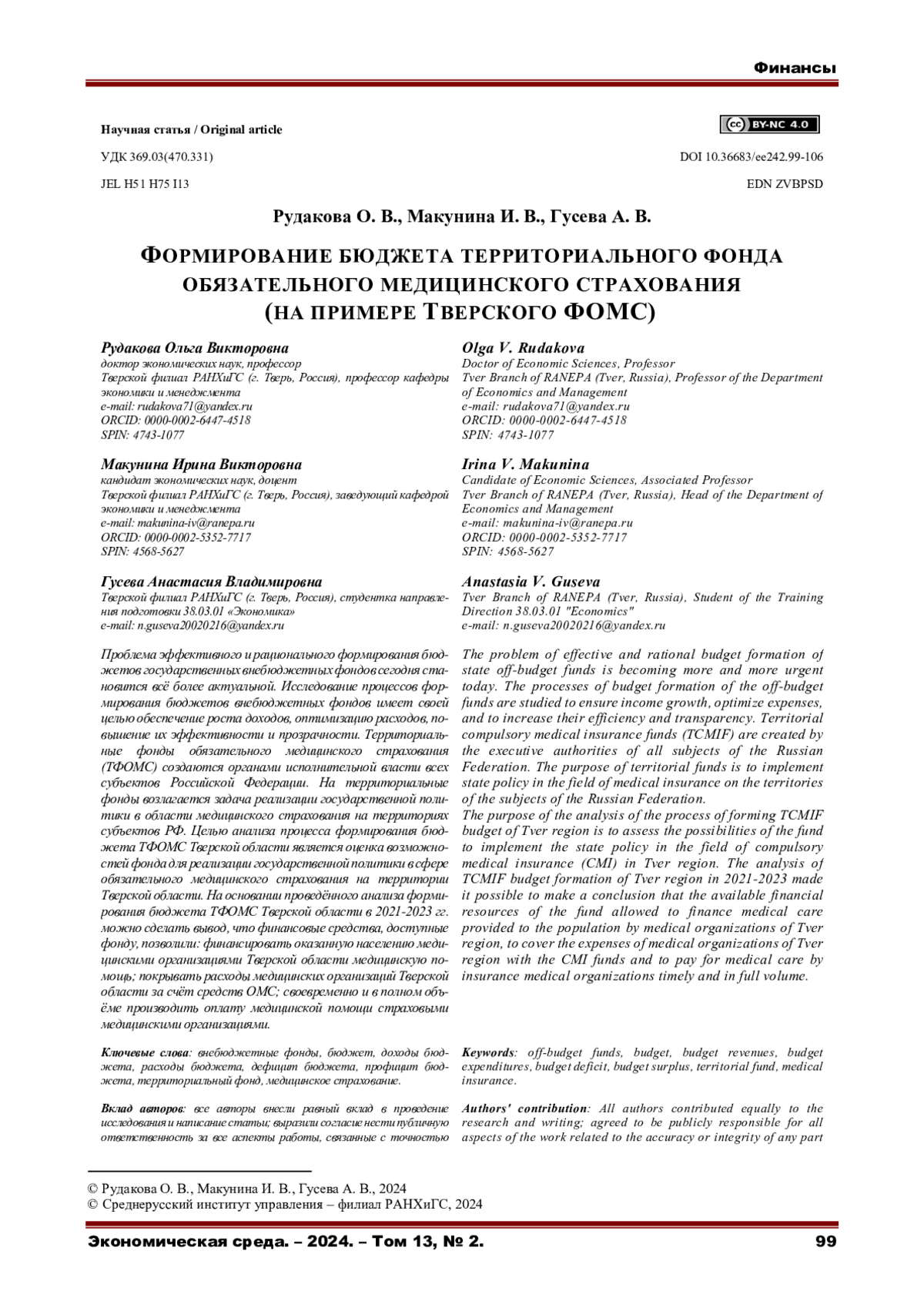 Проблема эффективного и рационального формирования бюджетов государственных внебюджетных фондов сегодня становится всё более актуальной. Исследование процессов формирования бюджетов внебюджетных фондов имеет своей целью обеспечение роста доходов, оптимизацию расходов, повышение их эффективности и прозрачности. Территориальные фонды обязательного медицинского страхования (ТФОМС) создаются органами исполнительной власти всех субъектов Российской Федерации. На территориальные фонды возлагается задача реализации государственной политики в области медицинского страхования на территориях субъектов РФ. Целью анализа процесса формирования бюджета ТФОМС Тверской области является оценка возможностей фонда для реализации государственной политики в сфере обязательного медицинского страхования на территории Тверской области. На основании проведённого анализа формирования бюджета ТФОМС Тверской области в 2021-2023 гг. можно сделать вывод, что финансовые средства, доступные фонду, позволили: финансировать оказанную населению медицинскими организациями Тверской области медицинскую помощь; покрывать расходы медицинских организаций Тверской области за счёт средств ОМС; своевременно и в полном объёме производить оплату медицинской помощи страховыми медицинскими организациями.