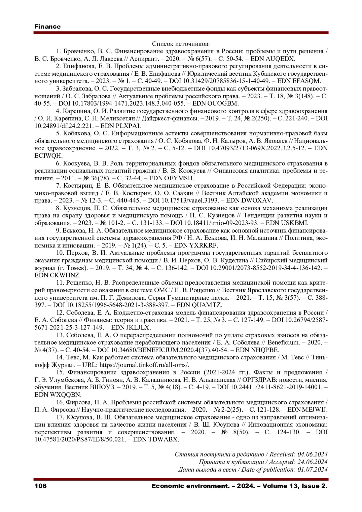 7. Костырин, Е. В. Обязательное медицинское страхование в Российской Федерации: экономико-правовой взгляд / Е. В. Костырин, О. О. Саакян // Вестник Алтайской академии экономики и права. - 2023. - № 12-3. - С. 440-445. DOI: 10.17513/vaael.3193 EDN: DWOXAV