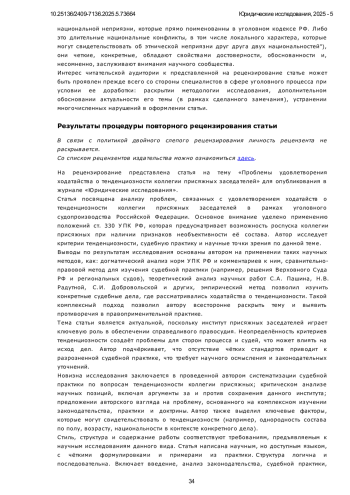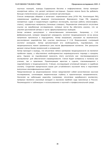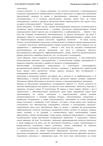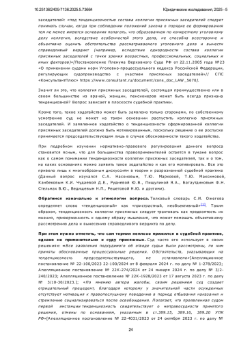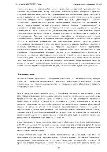 В связи с весьма лаконичным нормативно-правовым регулированием законодателя понятия тенденциозности состава присяжных заседателей и отсутствия критериев, соответствие которым позволило бы удовлетворить ходатайство о роспуске коллегии, научная литература изобилует противоречивыми дискуссиями на предмет необходимости существования такого института (вопросы тенденциозности изучались Насоновым С. А., Марковой Т. Ю., Максимовой Т. Ю., Моисеевой Т. В., Багаутдиновым Ф. Н., Мингалимовой М. Ф., Стельмах В. Ю., Ведищевым Н. П.), а судебная практика весьма немногочисленна и отсутствует ее единообразие. Поэтому предметом исследования данной статьи является понятие тенденциозности состава присяжных заседателей, поиск критериев, благодаря которым совокупность фактических обстоятельств конкретного уголовного дела и сложившийся состав присяжных заседателей удовлетворял бы понятию тенденциозности. Автор попытался проанализировать конкретные примеры судебной практики, сопоставить их с фактическими обстоятельствами рассматриваемого дела и вывести из них понимание тенденциозности, а также тех критериев, благодаря указанию которых такое ходатайство могло бы быть удовлетворено. Автором используется следующая методология: диалектический (философский), системный, а также социологический методы позволили изучить явление “тенденциозности” в развитии и во взаимосвязи с иными явлениями, в том числе социальными условиями, влияющими на него; юридический (догматический) метод позволил толковать нормы уголовно-процессуального права и выявить имеющиеся противоречия и пробелы в регулировании. Практика удовлетворения ходатайств о тенденциозности весьма немногочисленна, сегодня на практике возникают трудности в понимании что же нужно указать в подобном ходатайстве для благоприятного исхода. Новизна данного исследования заключается в том, что автор попытался изучить судебную практику и изложить собственные выводы по предмету содержания такого ходатайства: недостаточно указать лишь на дефект по признаку пола, расы, национальности или профессии сформированной коллегии. Вопрос о ее тенденциозности изучается в контексте конкретных фактических обстоятельств и особенностей рассматриваемого уголовного дела. То есть тенденциозной коллегия присяжных заседателей по мотивам того, что большинство из присяжных являются женщинами, будет актуальна лишь по делам о половых преступлениях, непосредственно связанных с взаимоотношениями полов. Заявить подобное ходатайство по делу о мошенничестве будет не убедительно.