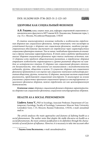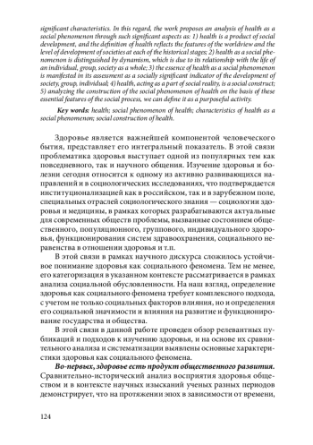 В статье анализируются основные подходы и особенности определения здоровья как социального феномена. Автор отмечает, что несмотря на устойчивый дискурс о здоровье как социальном феномене, наиболее распространенным обоснование выступает его определение через характеристику социальных факторов влияния. Тем не менее, необходимо принимать во внимание и другие значимые характеристики. В этой связи в работе предлагается анализ здоровья социального феномена через таких значимых аспектов, как: 1) здоровье есть продукт общественного развития, а определение здоровья отражает особенности мировоззрения и уровня развития обществ на каждом из исторических этапов; 2) здоровье как социальный феномен отличает динамичность, что обусловлено его взаимосвязью с жизнедеятельности индивида, группы, общества в целом; 3) сущность здоровья как социального феномена проявляется в его оценке как социально значимого индикатора развития общества, группы, личности; 4) здоровье, выступая частью социальной реальности, представляет социальный конструкт; 5) анализируя на основе указанных сущностных признаков социального процесса конструирование социального феномена здоровья, можно определить его как целенаправленную деятельность.