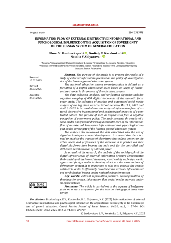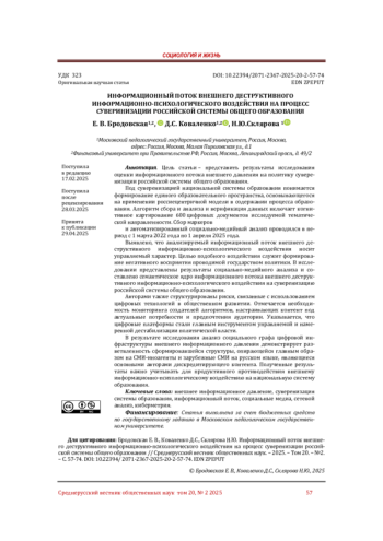 Цель статьи - представить результаты исследования оценки информационного потока внешнего давления на политику суверенизации российской системы общего образования. Под суверенизацией национальной системы образования понимается формирование единого образовательного пространства, основывающегося на применении россиецентричной модели в содержании процесса образования. Алгоритм сбора и анализа и верификация данных включает когнитивное картирование 600 цифровых документов исследуемой тематической направленности. Сбор маркеров и автоматизированный социально-медийный анализ проводился в период с 1 марта 2022 года по 1 апреля 2025 года. Выявлено, что анализируемый информационный поток внешнего деструктивного информационно-психологического воздействия носит управляемый характер. Целью подобного воздействия служит формирование негативного восприятия проводимой государством политики. В исследовании представлены результаты социально-медийного анализа и составлено семантическое ядро информационного потока внешнего деструктивного информационно-психологического воздействия на суверенизацию российской системы общего образования. Авторами также структурированы риски, связанные с использованием цифровых технологий в общественном развитии. Отмечается необходимость мониторинга создателей алгоритмов, настраивающих контент под актуальные потребности и предпочтения аудитории. Указывается, что цифровые платформы стали главным инструментом управляемой и намеренной дестабилизации политической власти. В результате исследования анализ социального графа цифровой инфраструктуры внешнего информационного давления демонстрирует разветвленность сформировавшейся структуры, опирающейся главным образом на СМИ-иноагенты и зарубежные СМИ на русском языке, являющиеся основными авторами дискредитирующего контента. Полученные результаты важно учитывать для продуктивного противодействия внешнему информационно-психологическому воздействию на национальную систему образования.