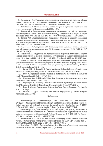 3. Жевлакович С.С. К вопросу о суверенизации национальной системы образования // Психология и педагогика служебной деятельности. 2022. №3. С. 127-135. DOI: 10.24412/2658-638X-2022-3-127-135 EDN: IMYOVH