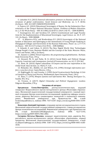 8. Склярова Н.Ю., Бродовская Е.В. Суверенизация национальной системы образования и воспитания в оценках молодежи, обучающейся в педагогических ссузах и вузах РФ // Власть. 2023. №2. С. 9-14. DOI: 10.31171/vlast.v31i2.9516 EDN: XJRNQA