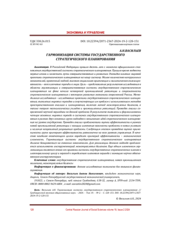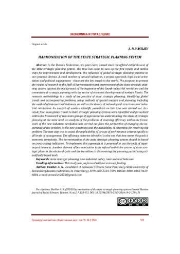 В Российской Федерации прошло десять лет с момента официального становления государственной системы стратегического планирования. Пришло время подвести первые итоги и наметить пути совершенствования и развития. Очевидно влияние мировой практики стратегического планирования на нашу систему. Малое количество натуральных показателей, проектный подход, высокая социальная ориентация и политическая ангажированность - вот ключевые тренды в мире. Цель - представление результатов исследования в области гармонизации и совершенствования системы государственного стратегического планирования на фоне начала четвертой промышленной революции и сопряженности стратегического планирования с вектором развития экономики современной России. Методология исследования - исследование практики государственного стратегического планирования, выявление мировых трендов и сопутствующих им проблем с использованием методов пространственного анализа и планирования, включая метод межотраслевых балансов, а также теорию технологических укладов и промышленных революций. Проведен анализ современной научной периодики по данной проблеме. В результате выявлены и формализованы четыре основных мировых тренда в системах государственного стратегического планирования в рамках двух основных групп подходов к пониманию идей стратегического планирования на уровне государства. Проведен анализ проблематики оценки эффективности в рамках новой промышленной революции с позиции изменения важности проблемы в новых условиях и наличия направлений разрешения проблемы. Следующим этапом проведена оценка применимости групп критериев эффективности равнозначно на всех уровнях управления. В качестве наиболее отвечающего целям определен критерий эффективности - экономическая сложность. Гармонизация системы государственного стратегического планирования должна базироваться на сквозных показателях. Для реализации данного подхода предлагается использовать инструментарий межотраслевых балансов. Еще одним элементом гармонизации является отказ от привязки системы государственных стратегических планов к электоральному циклу и переход к определению планового периода с помощью научно обоснованного инструментария.