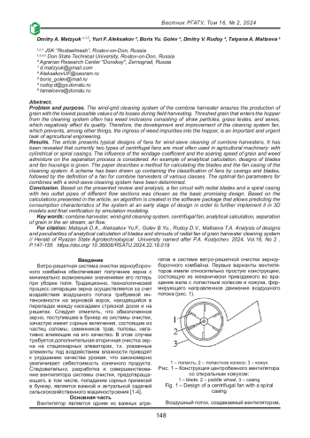 Проблема и цель. Ветро-решетная система очистки зерноуборочного комбайна обеспечивает получение зерна с минимально возможными значениями его потерь при уборке поля. Обмолоченное зерно, поступившее в бункер из системы очистки, зачастую имеет сорные включения, состоящие из частиц соломы, семенников трав, половы, негативно влияющие на его качество. Поэтому разработка и совершенствование вентилятора системы очистки, предотвращающего, в том числе, попадание сорных примесей в бункер, является важной и актуальной задачей сельскохозяйственного машиностроения.