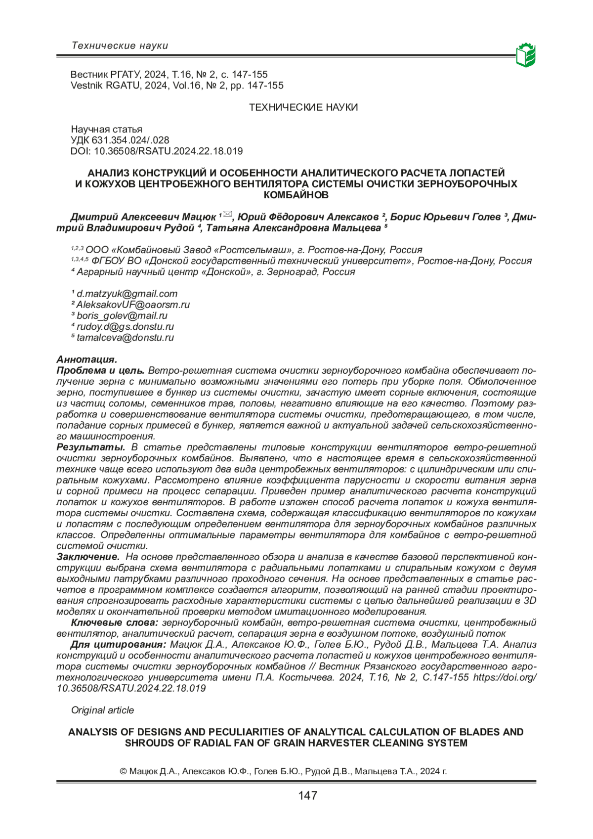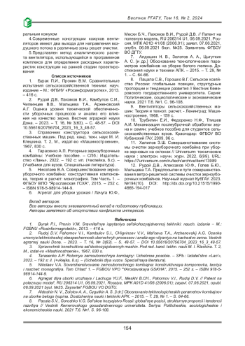 12. Рудой Д.В., Алексаков Ю.Ф., Голев Б.Ю., Мальцева Т.А. Предпосылки и пути совершенствования ветро-решетной системы очистки зерноуборочных комбайнов. Научный журнал КубГАУ. 2023. №194(10). DOI: 10.21515/1990-4665-194-017