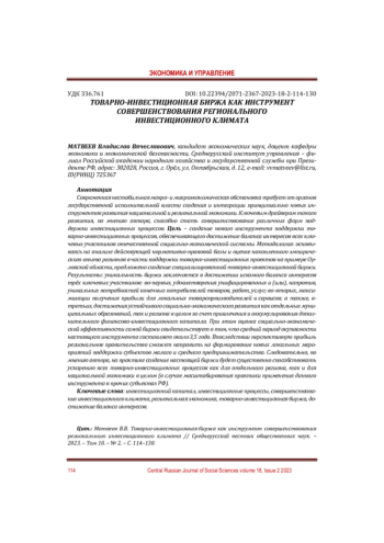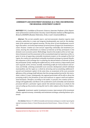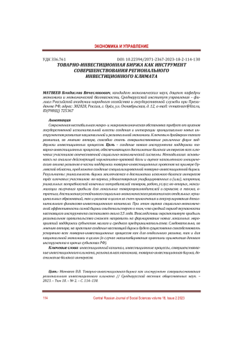 Современная нестабильная макро- и микроэкономическая обстановка требует от органов государственной исполнительной власти создания и интеграции принципиально новых инструментов развития национальной и региональной экономики. Ключевым драйвером такого развития, по мнению автора, способно стать совершенствование различных форм поддержки инвестиционных процессов. Цель - создание нового инструмента поддержки товарно-инвестиционных процессов, обеспечивающего достижение баланса интересов всех ключевых участников отечественной социально-экономической системы. Методология: основываясь на анализе действующей нормативно-правовой базы и оценке накопленного эмпирического опыта регионов в части поддержки товарно-инвестиционных проектов на примере Орловской области, предложено создание специализированной товарно-инвестиционной биржи.