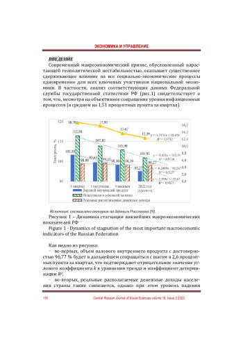 Современный макроэкономический кризис, обусловленный нарастающей геополитической нестабильностью, оказывает существенное сдерживающее влияние на все социально-экономические процессы одновременно для всех ключевых участников национальной экономики. В частности, анализ соответствующих данных Федеральной службы государственной статистики РФ (рис.1) свидетельствует о том, что, несмотря на объективное сокращение уровня инфляционных процессов (в среднем на 1,51 процентных пункта за квартал).